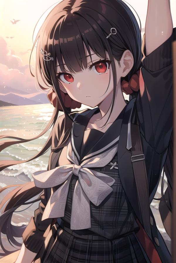 Appearance: harukawa maki, long hair, bangs, brown hair, black hair, hair ornament, (red eyes:1.5), twintails, very long hair, hairclip, blunt bangs, mole under eye, low twintails, scrunchie, hair scrunchie, red scrunchie,