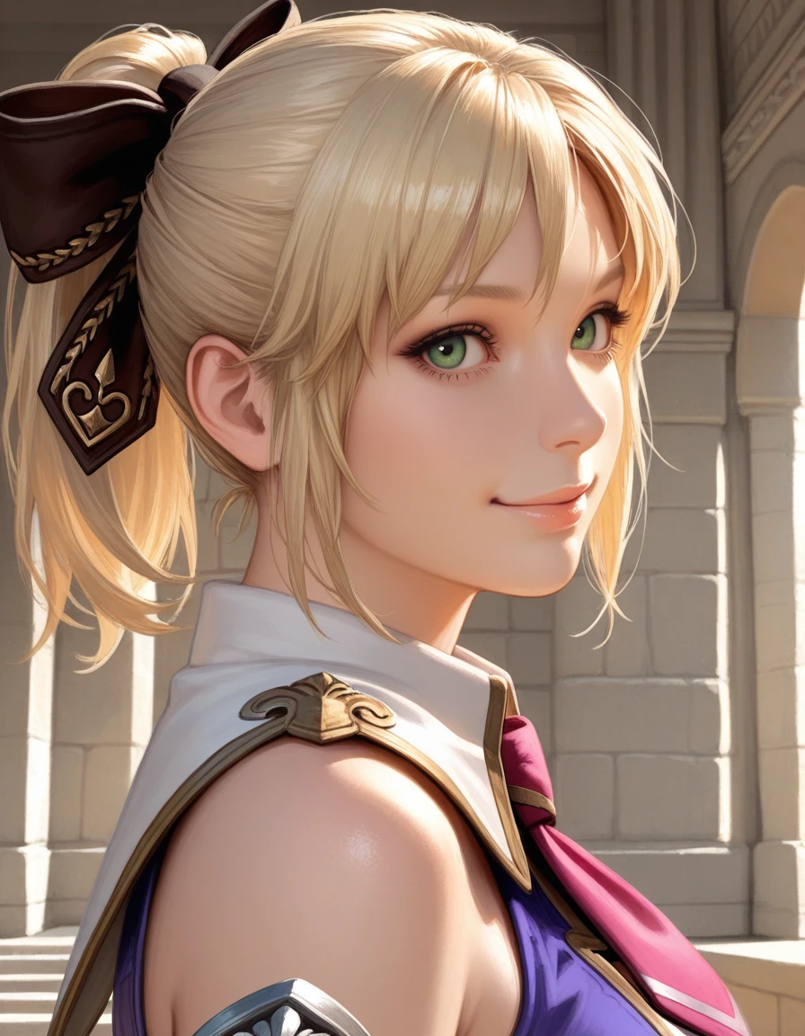 Positive prompt: 1girl, cassandra alexandra, blonde ponytail, green eyes, necktie, shoulder armor, armor, cleavage, elbow gloves, thighhighs, thigh boots