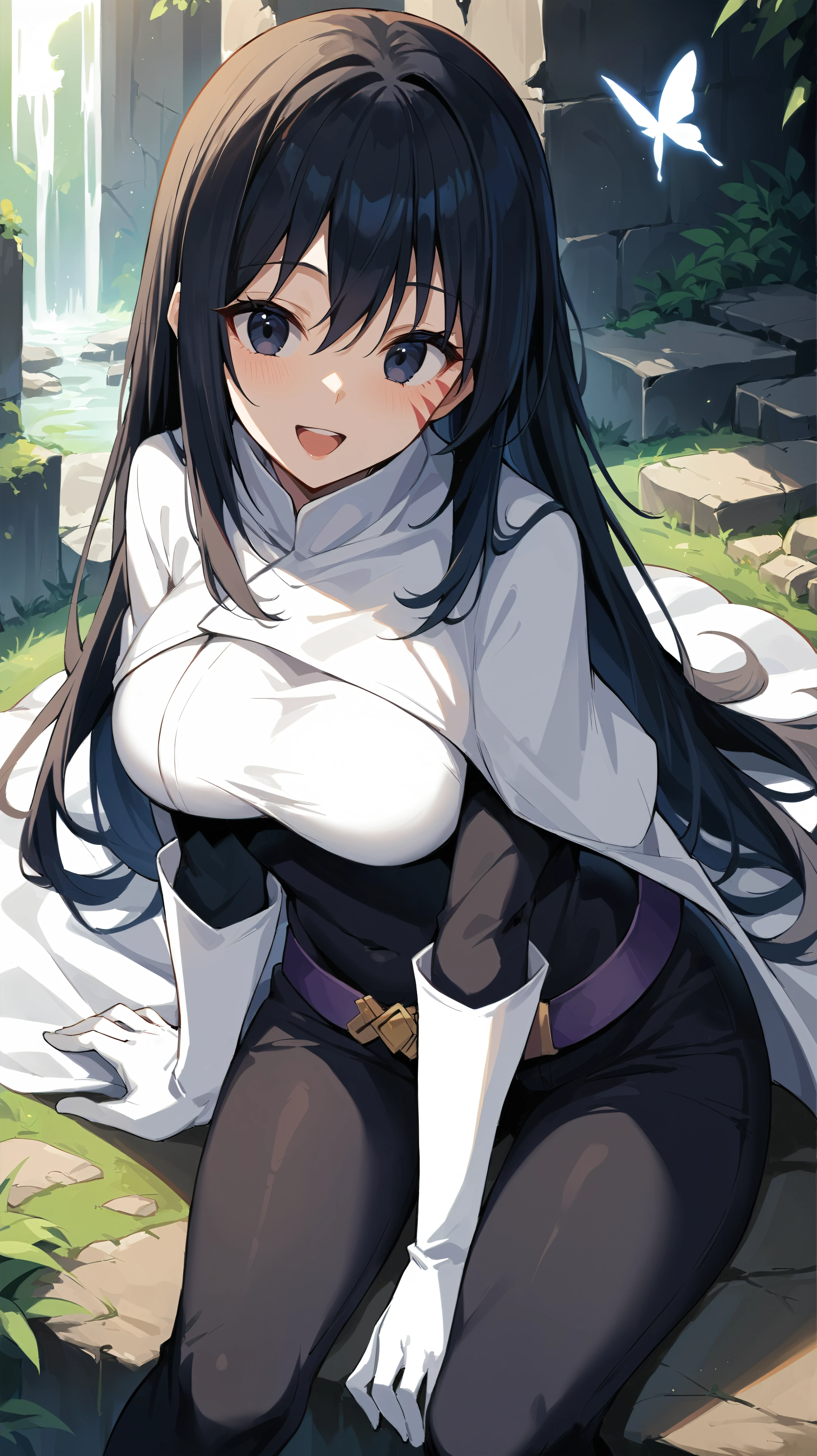white shirt, white cape, black pants, long hair, black hair, dark blue eyes, white gloves