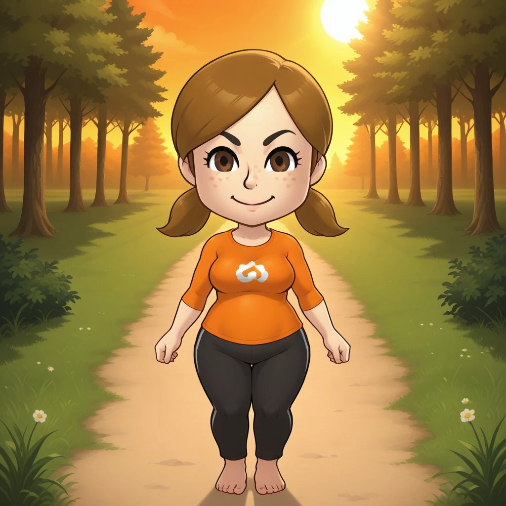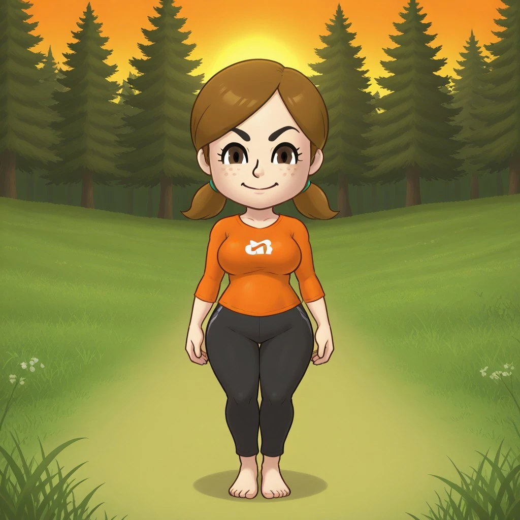 wii, mii, wii sports, 1girl, cute, female mii, brown hair, low ponytails, black eyebrows, brown eyes, freckles, orange clothing, black pants, barefoot, LuciaWS, breasts, nintendo mii, modern_mii, classic_mii