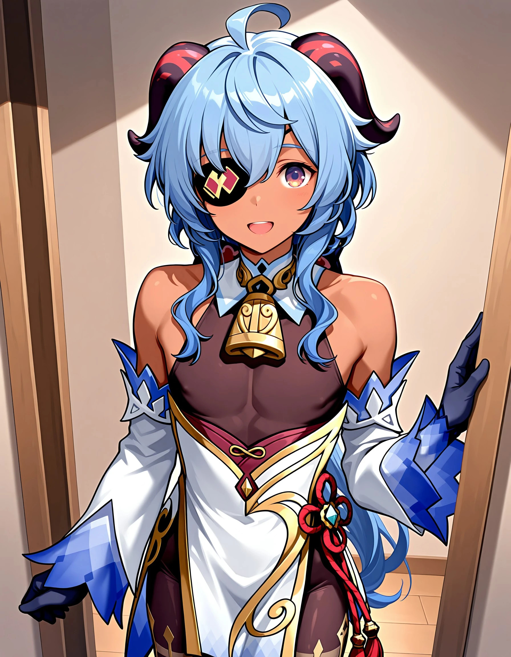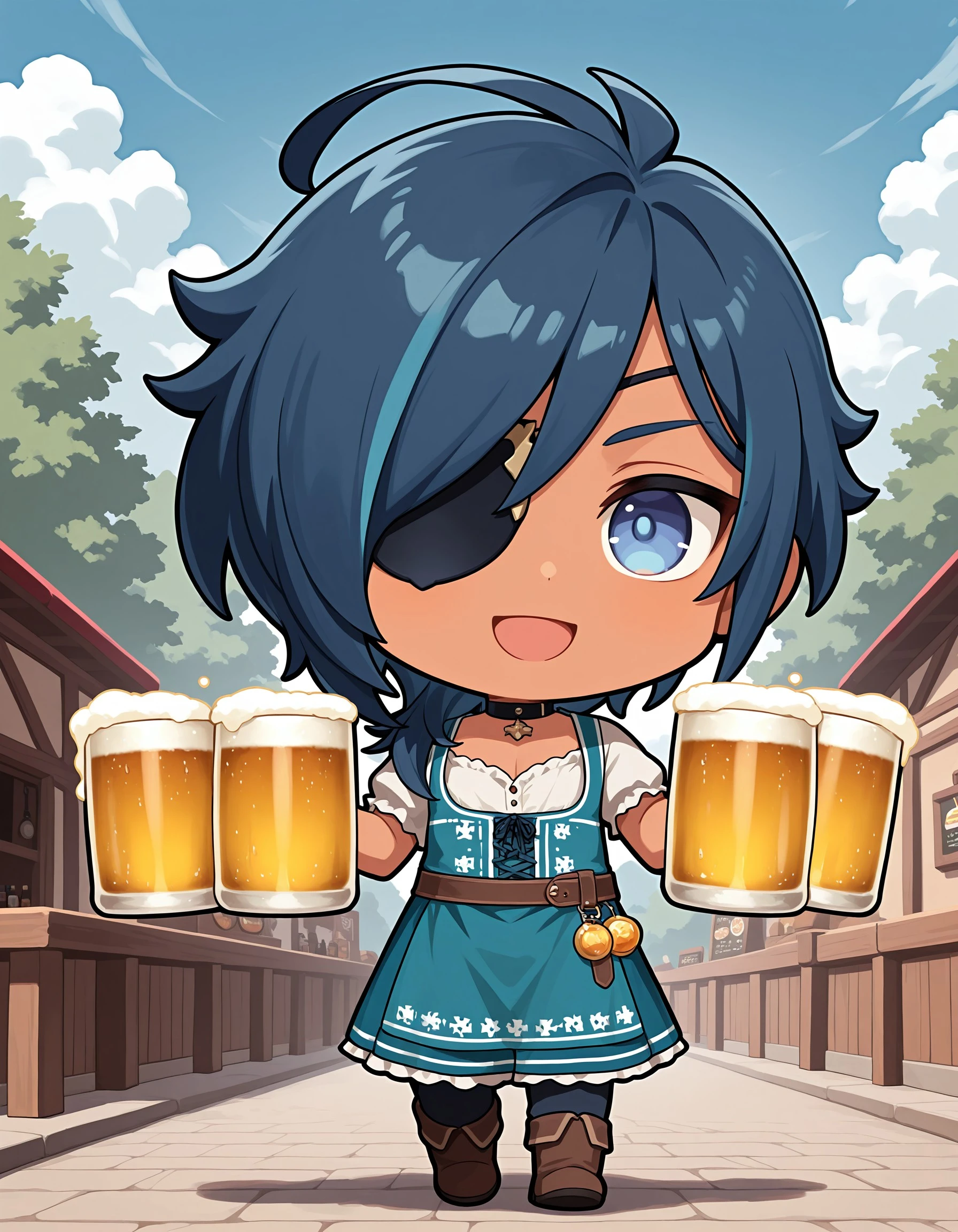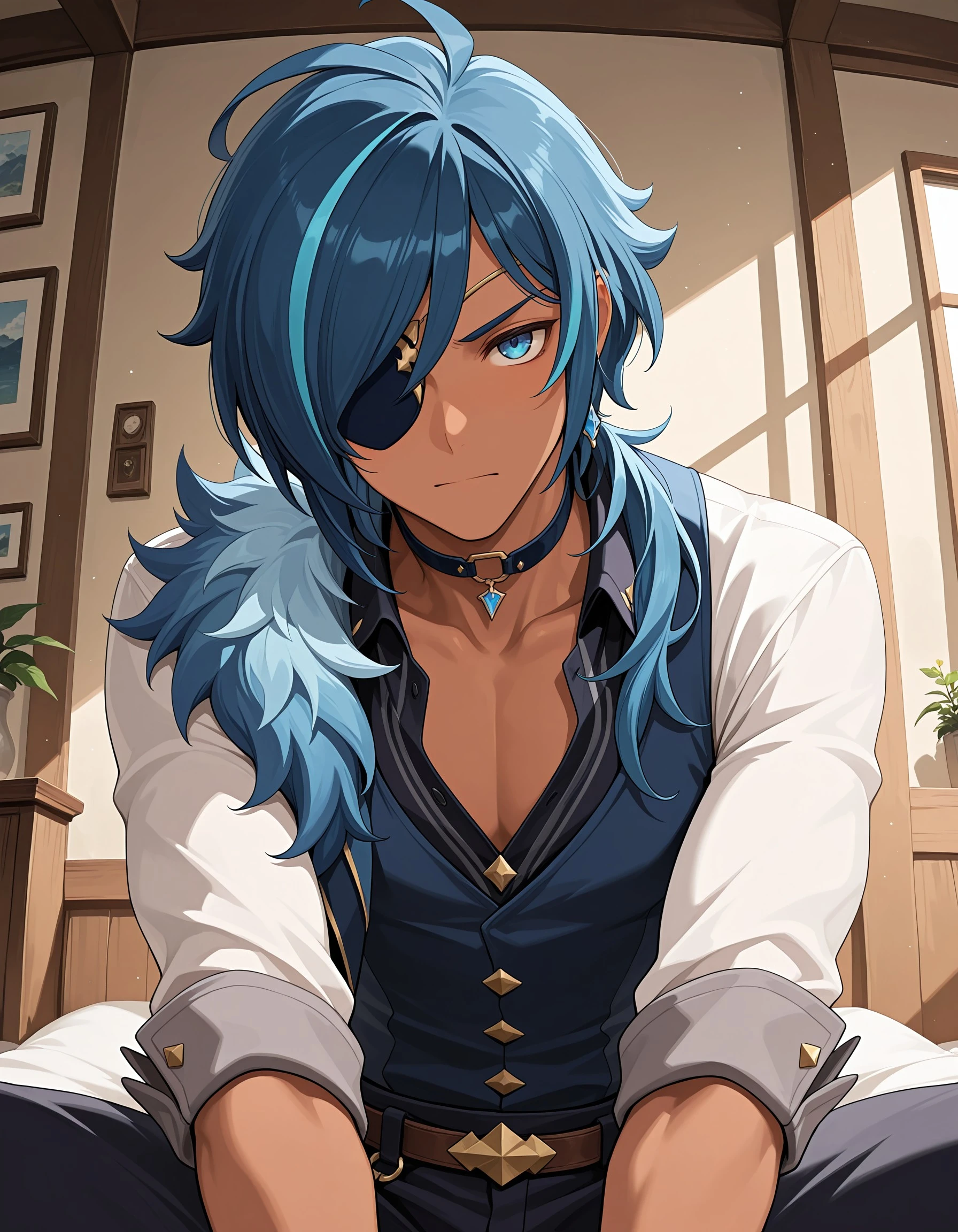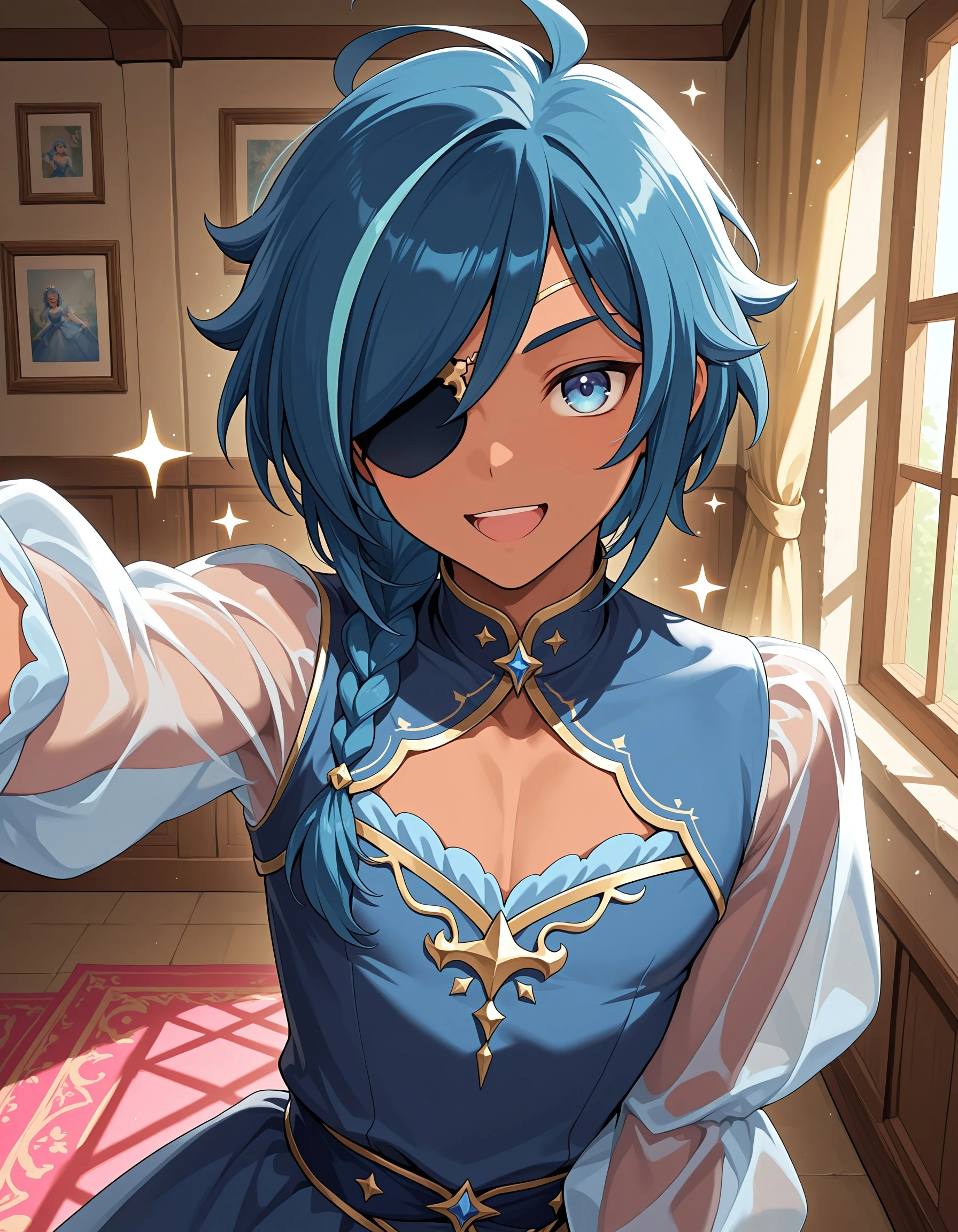ky_abr, blue hair, blue eyes, male focus, dark skinned male, eyepatch