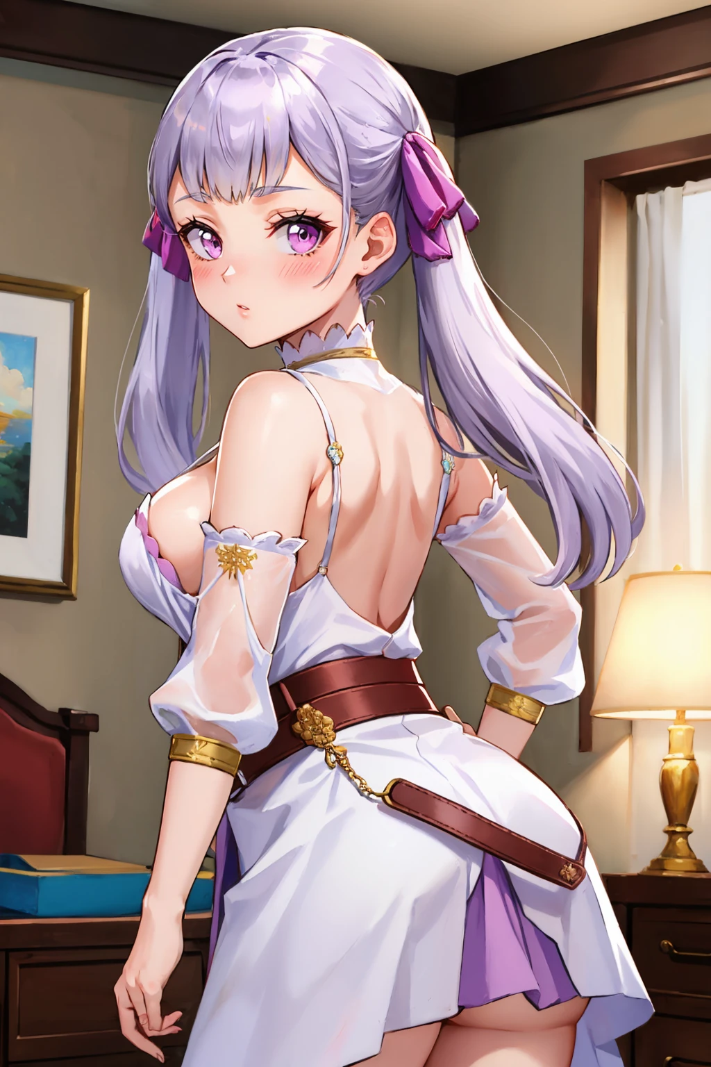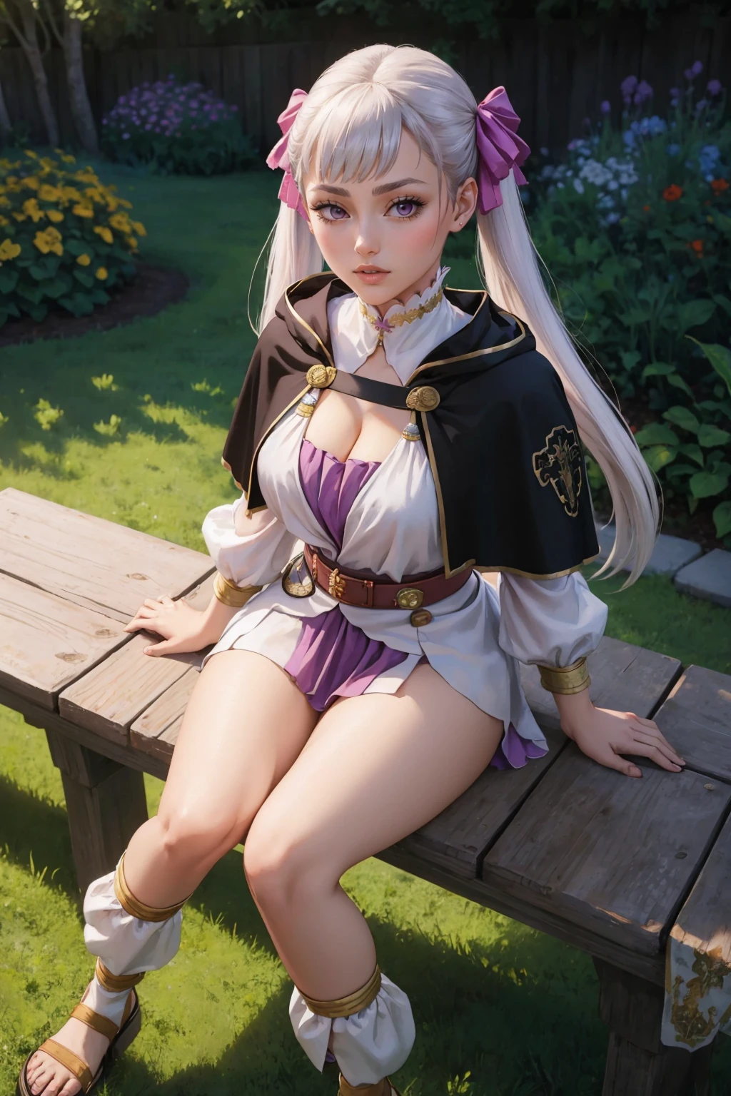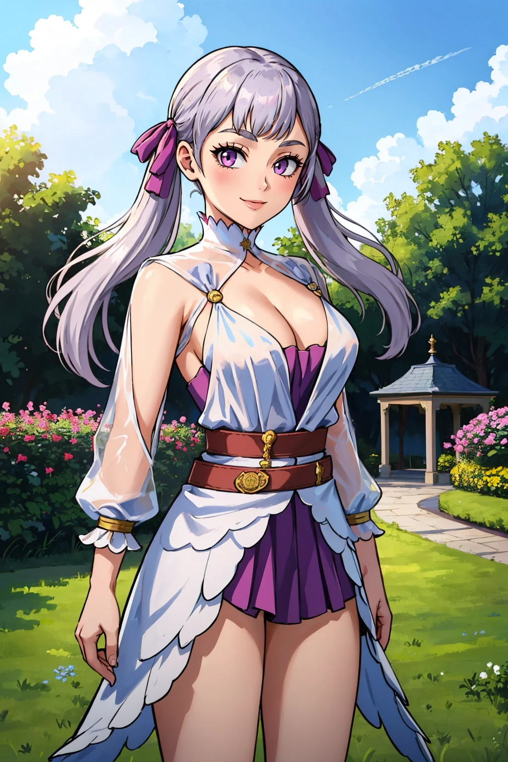 Add "noelle silva, purple eyes, twintails, hair ribbon, cleavage, white and purple dress, long sleeves, belt" for her typical look.