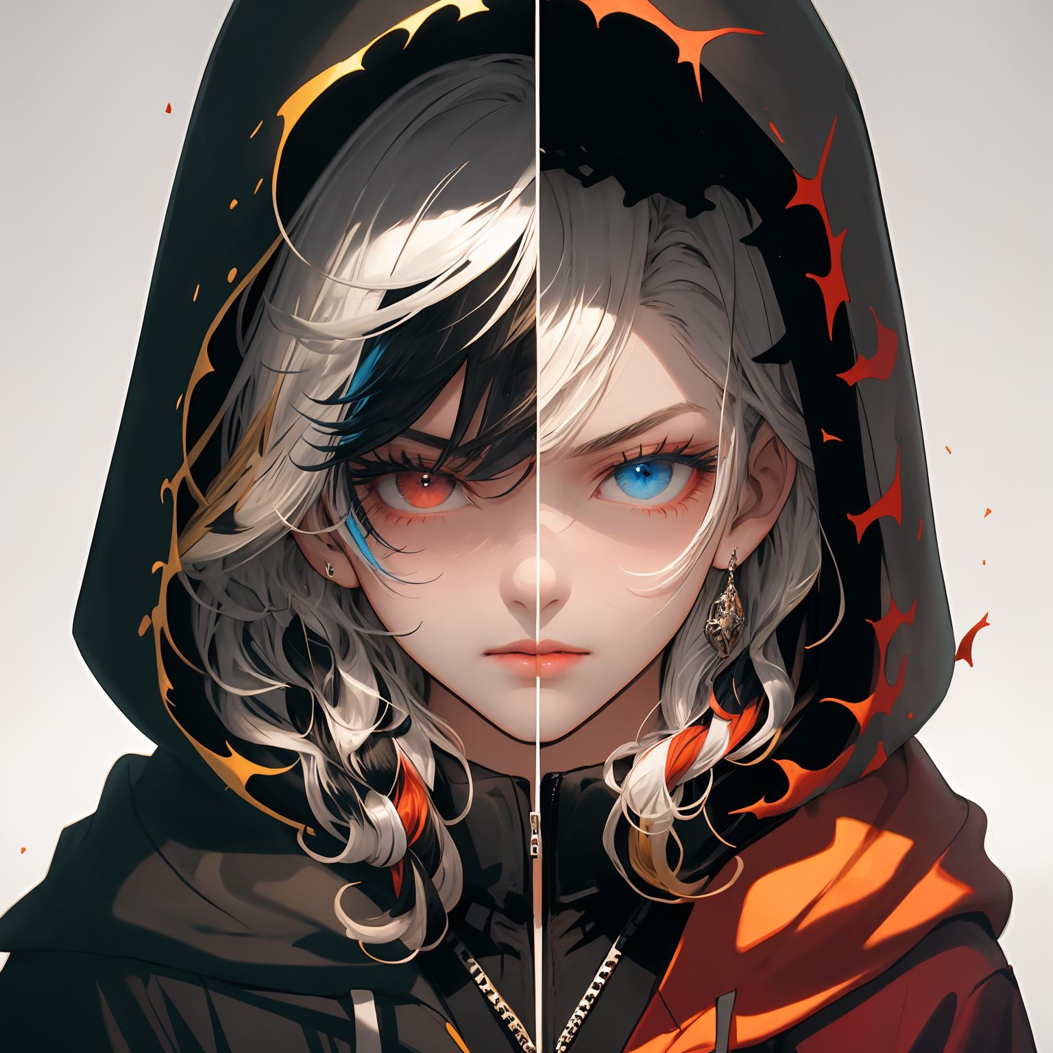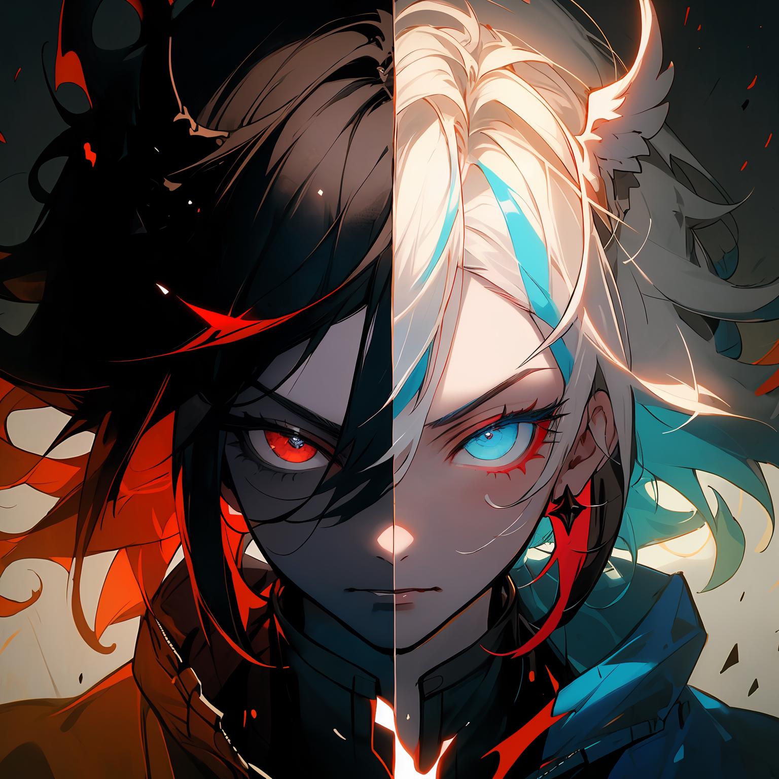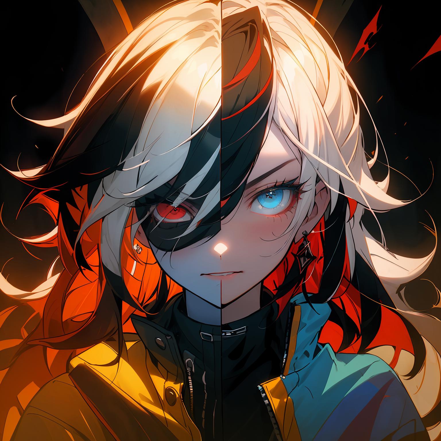 Here are some basic prompt words: 1girl,split theme,(heterochromia:1.2),angel and demon,(two-tone hair:1.2),(chiaroscuro:1.2),one eye covered:1.2,(on the left is black hair and red eyes,on the right is white hair and blue eyes:1.2),(cowboy_shot:1.2),(shirt:1.2),(black_background:1.1)