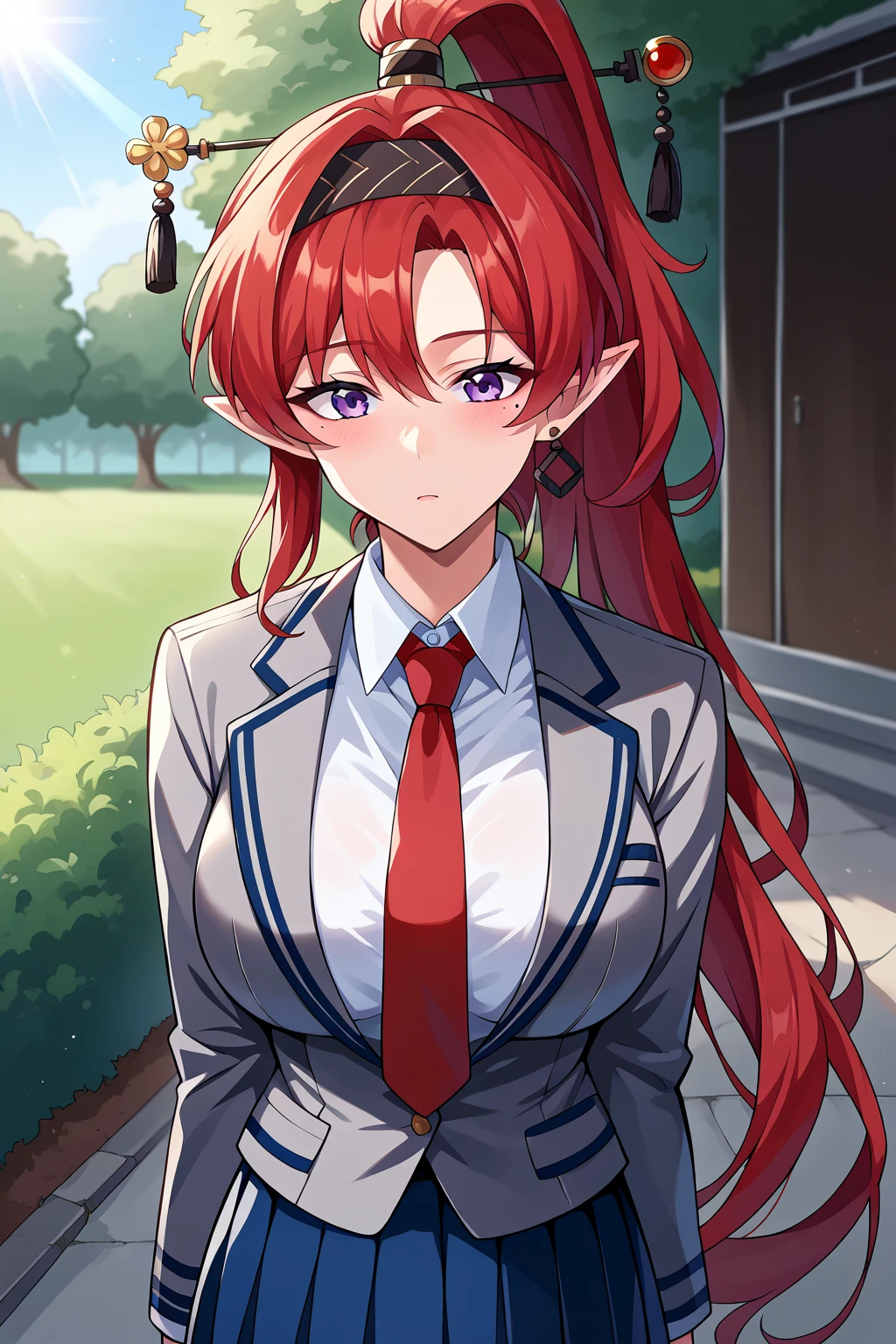 appearance tags; YinLinWW, red hair, high ponytail, hair stick, purple eyes, single earing, pointy ears, mole under eye