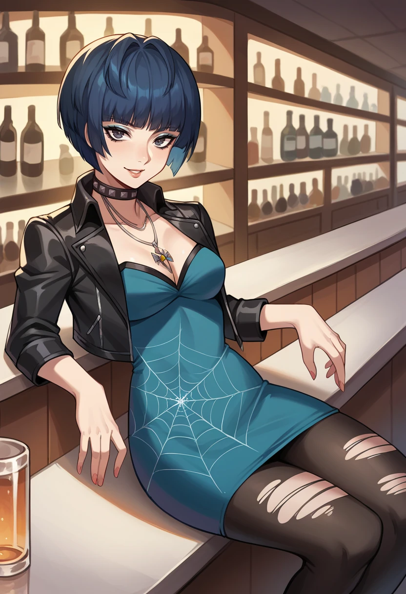 Alt. tags: takemicasualp5, short hair, bob cut, black hair, blue hair, choker, necklace, leather jacket, blue dress, spiderweb, ripped pantyhose, makeup, eyeliner,