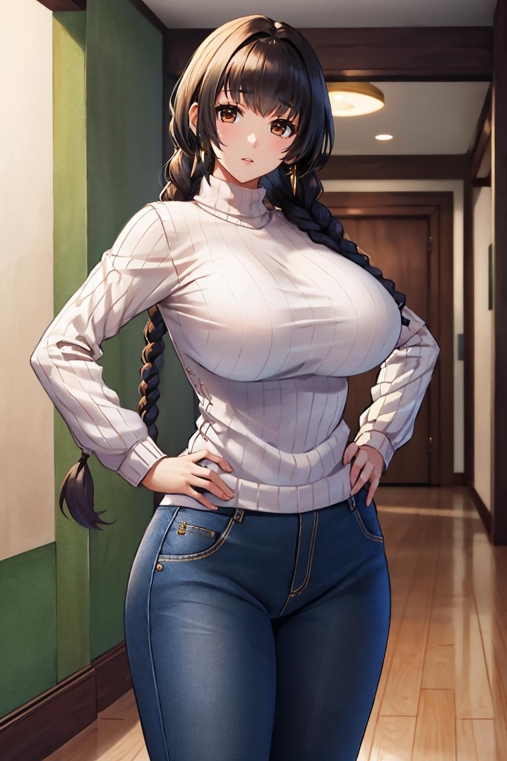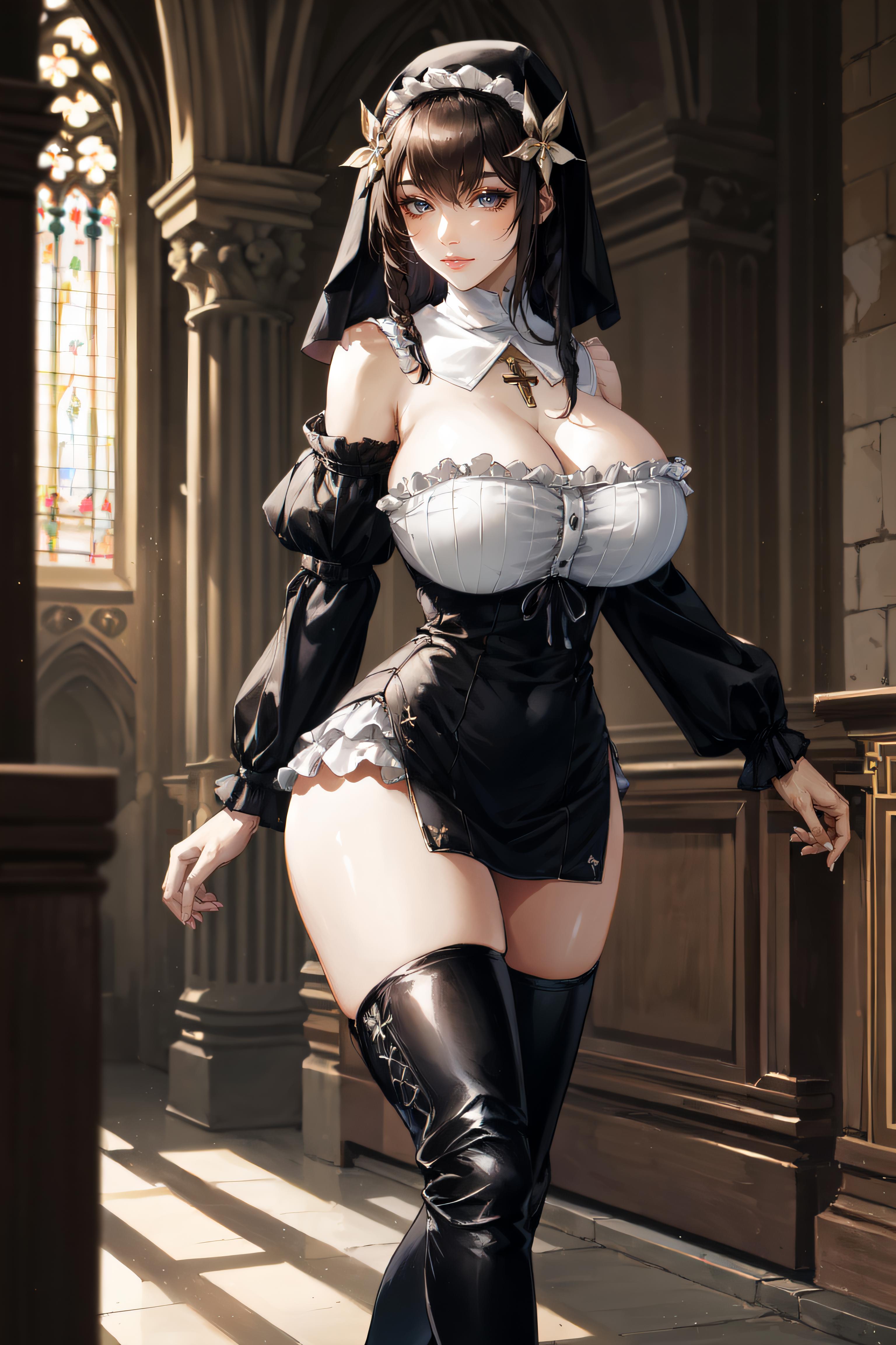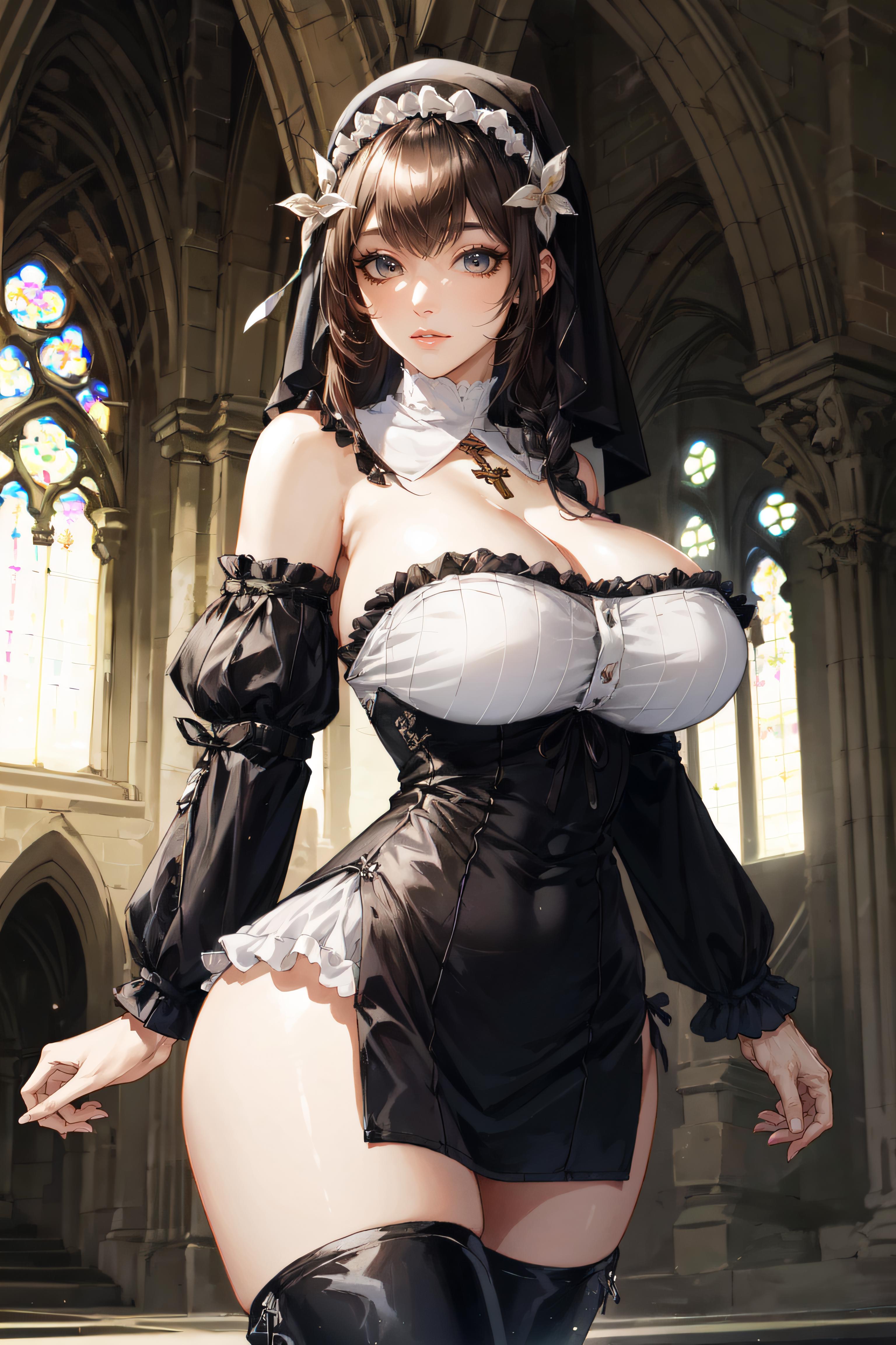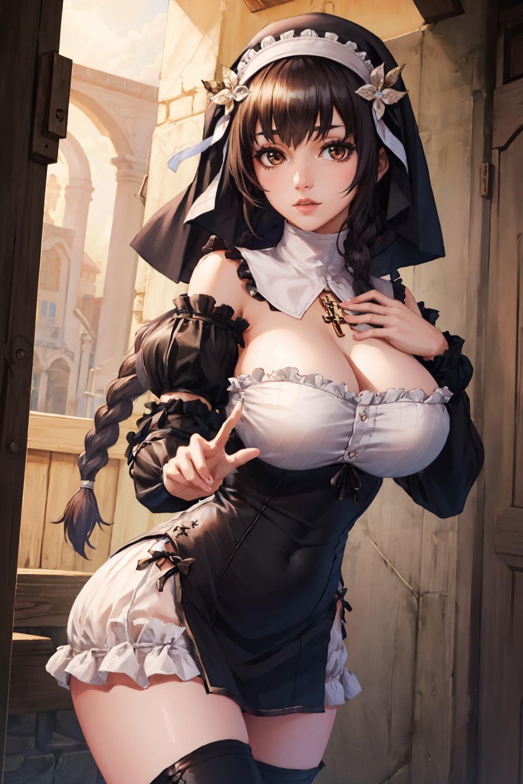 Add "twin braids, nun, habit, detached collar, cross necklace, cleavage, black dress, frills, detached sleeves, black sleeves" for her default look.