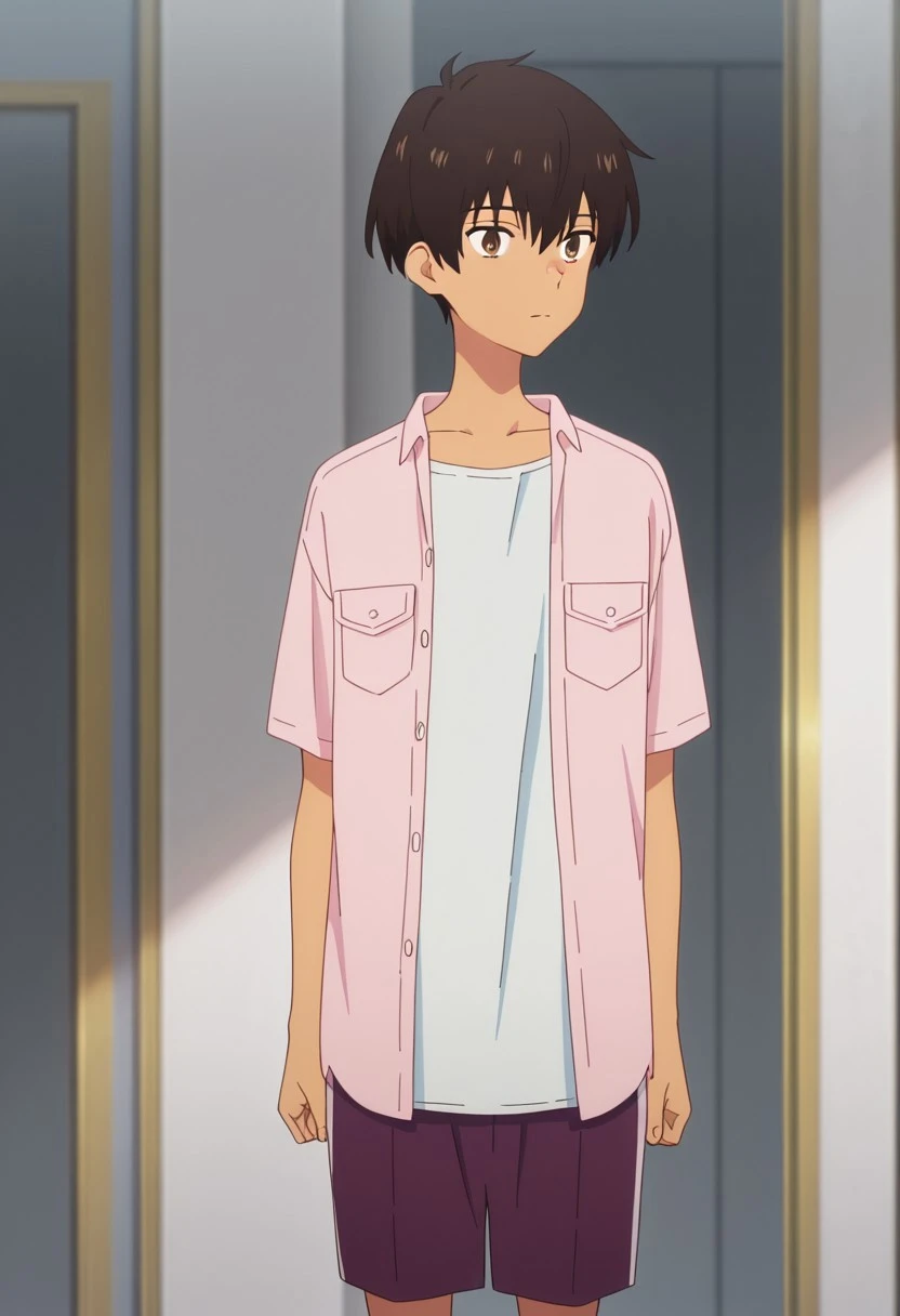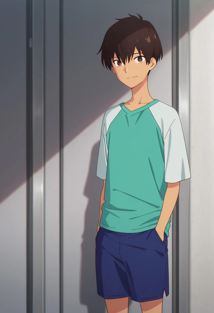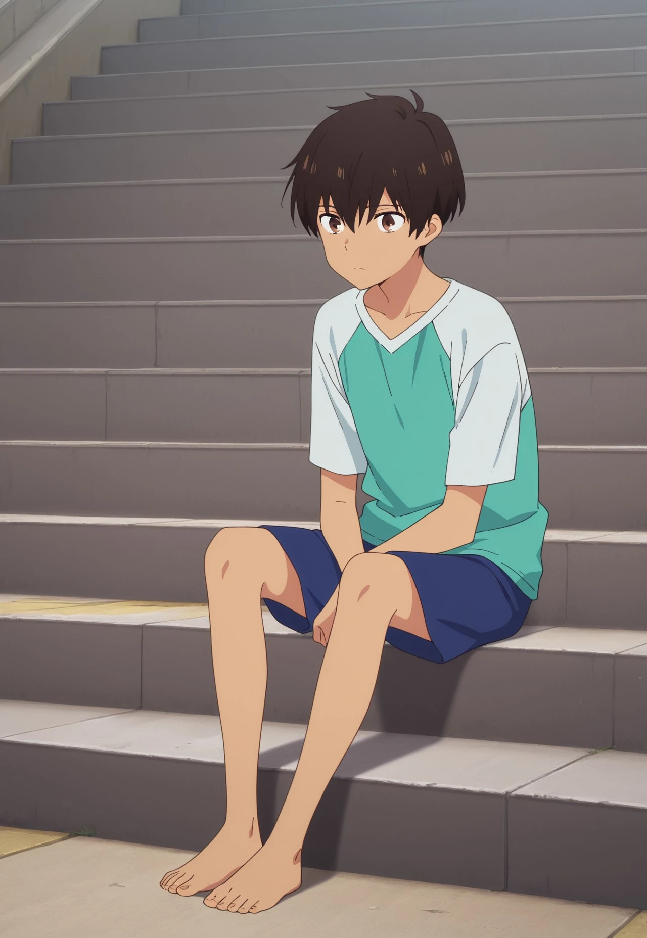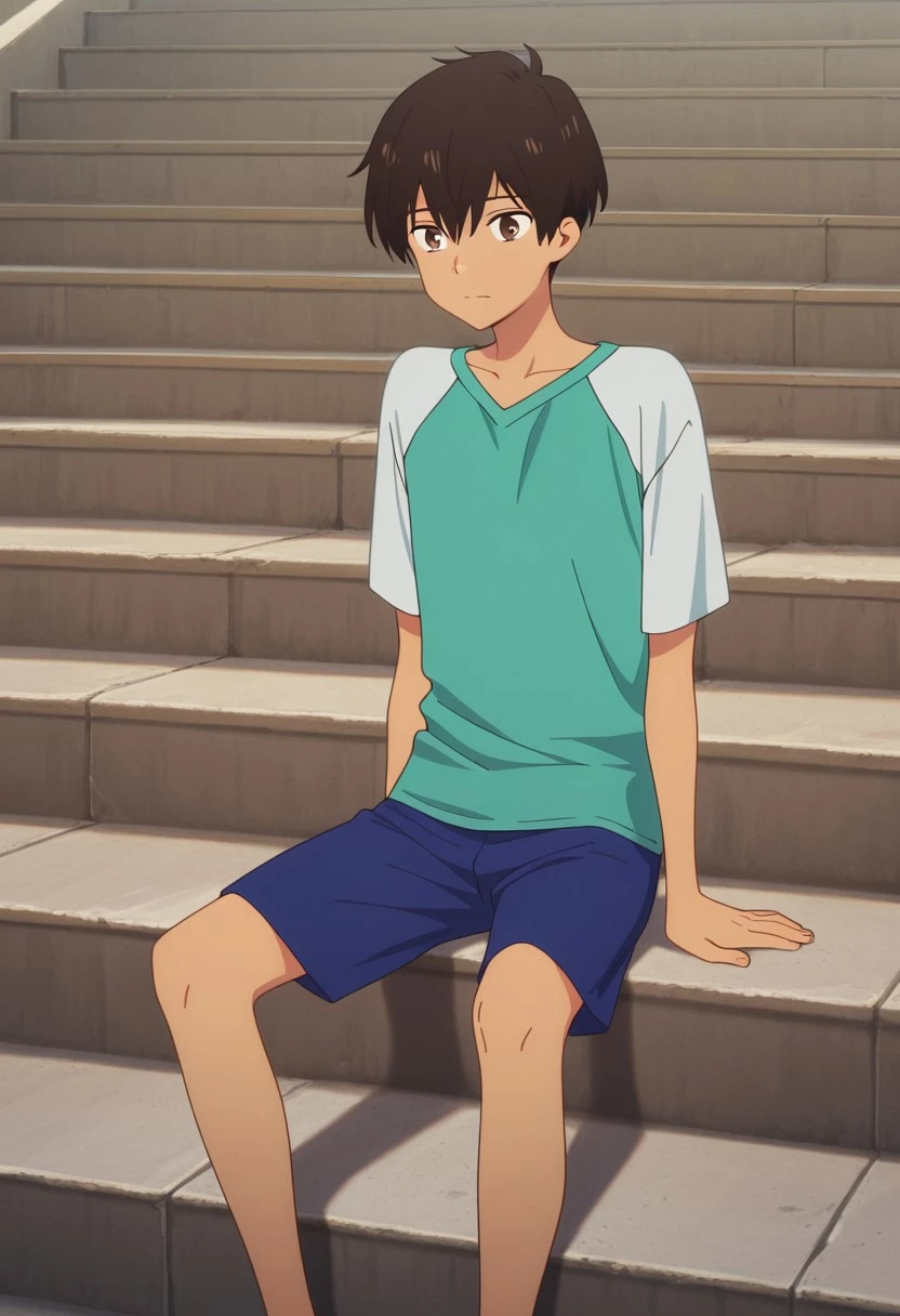 rionmizumori, 1boy, male focus, shorts, brown eyes, brown hair, dark skin, dark-skinned male, shoes, blue shorts, sneakers, shirt, raglan sleeves, yellow shoes,