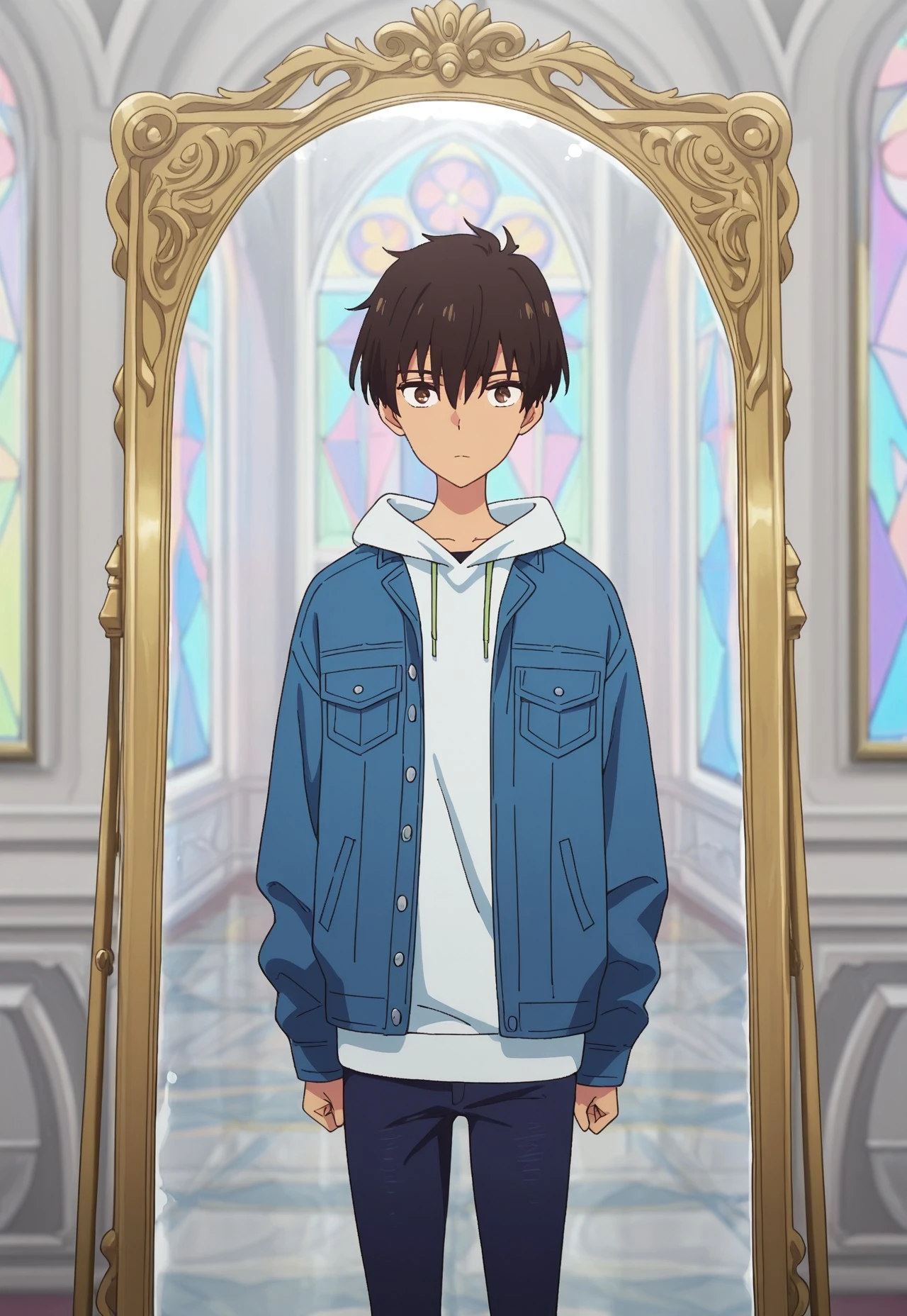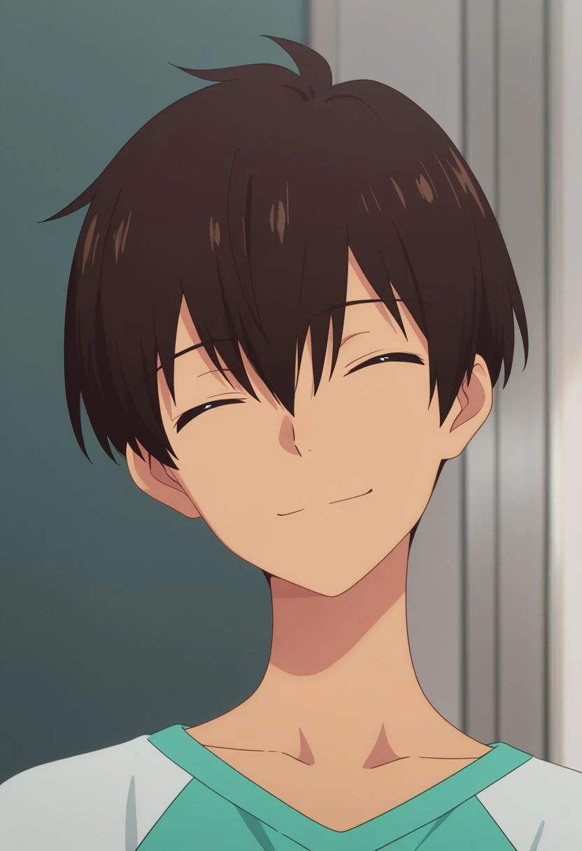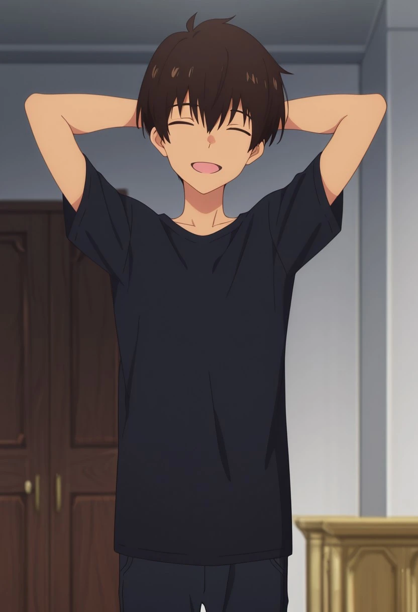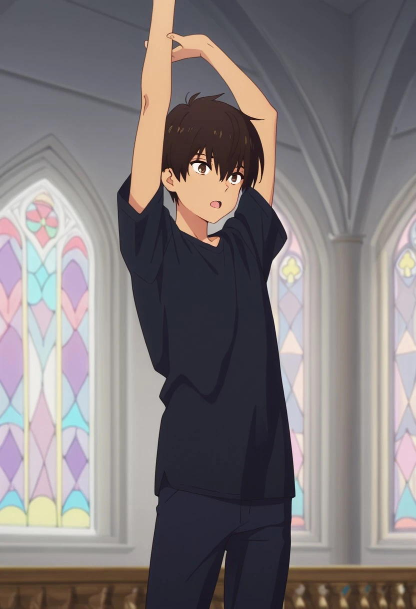 rionmizumori, 1boy, male focus, shorts, brown eyes, brown hair, dark skin, dark-skinned male, shoes, blue shorts, sneakers, shirt, raglan sleeves, yellow shoes,