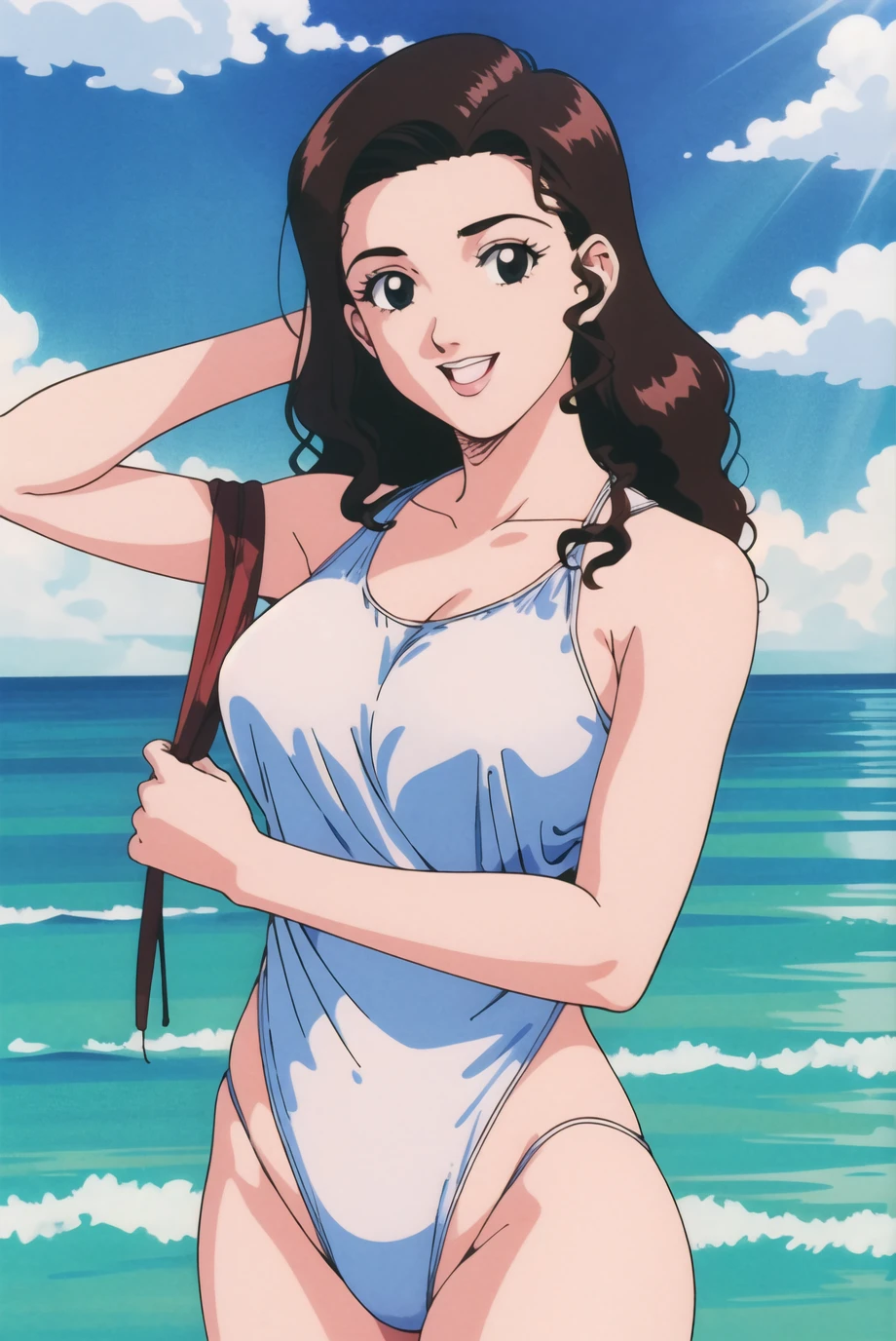 Inoue Ayako,hat, shirt, pink shirt, smile, baseball cap, upper body, ponytail, retro artstyle,1990s \(style\),brown hair,backwards hat,