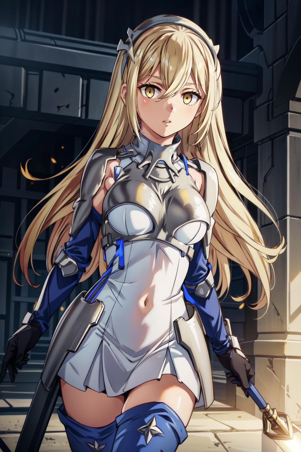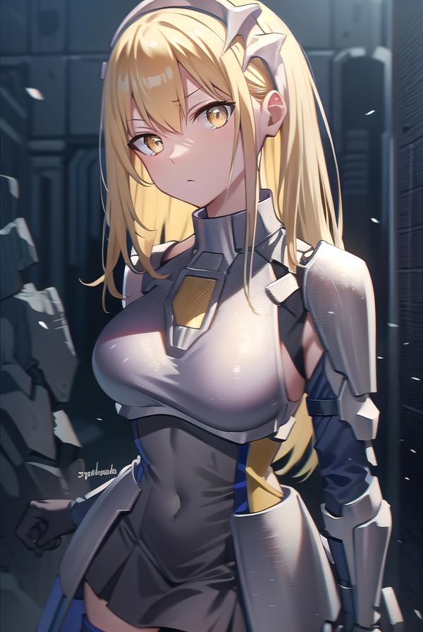 aiz wallenstein, blonde hair, hair between eyes, hairband, long hair, (yellow eyes:1.5), sidelocks