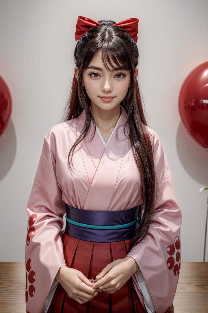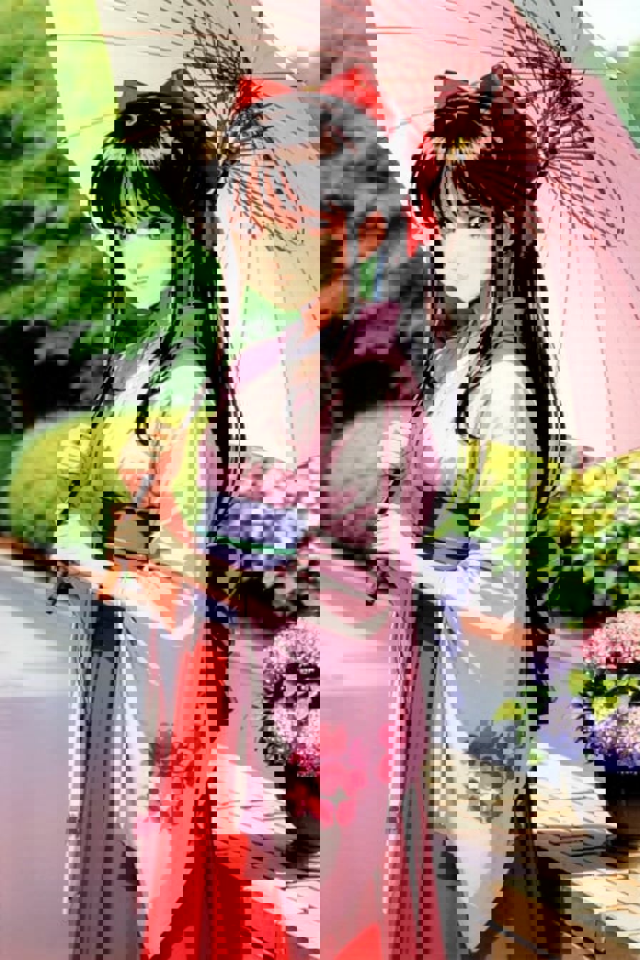 (1990s \(style\):1.2),sakura shinguuji (sakure wars), 1girl, umbrella, solo, japanese clothes, long hair, flower, oil-paper umbrella, kimono, hydrangea, bow