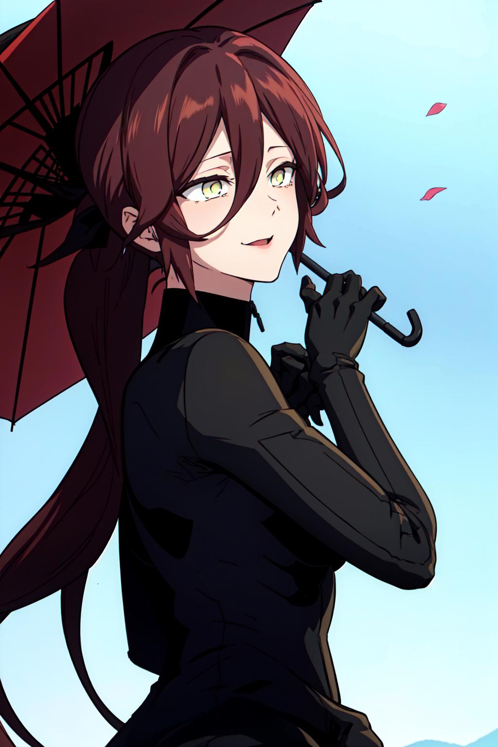 long hair, brown hair, hair between eyes, very long hair, yellow eyes, ponytail,