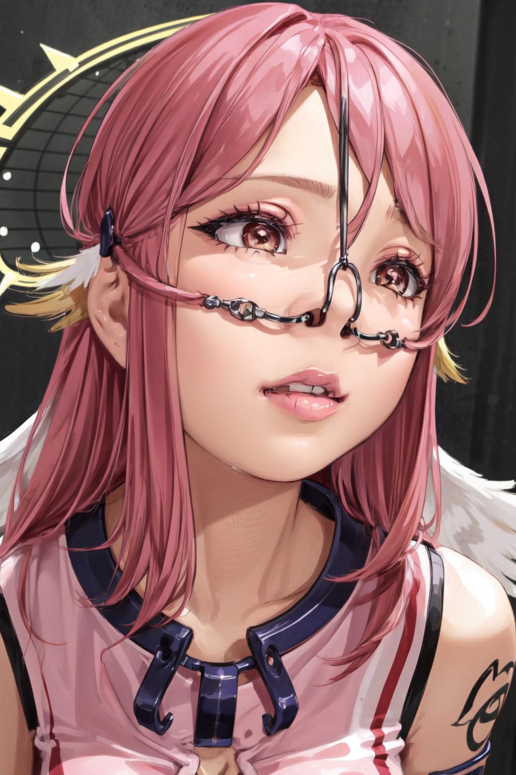 Finetuning: long hair,pink hair,halo,large breasts,symbol-shaped pupils,tatoo,cleavage,low wings,gloves, sideboob,midriff,asymmetrical legwear,mismatched legwear,drooling