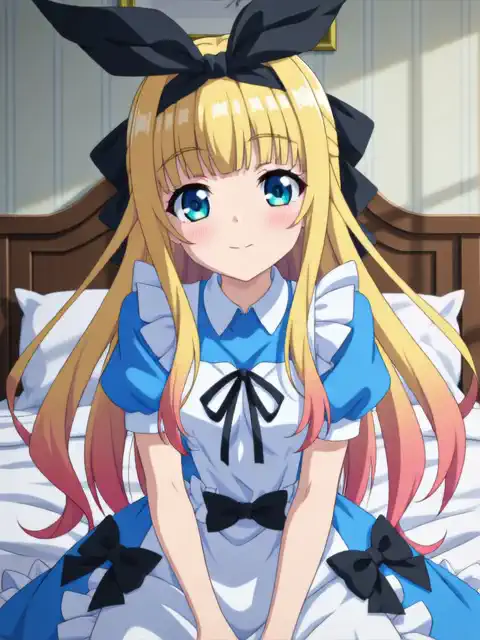 sample prompt:Mononobe Alice, anime-style girl. The image features an anime-style character with long, flowing hair that transitions from blonde at the front to pink at the back, with large black bows on both sides of her head. The character has large, expressive blue eyes and is wearing a white dress adorned with black bows. The dress includes a blue collar and sleeves, complemented by a white apron tied around the waist, and black bows at the waist. (she is dancing:4.0), (chibi Nendoroid:4.5) in bedroom.
