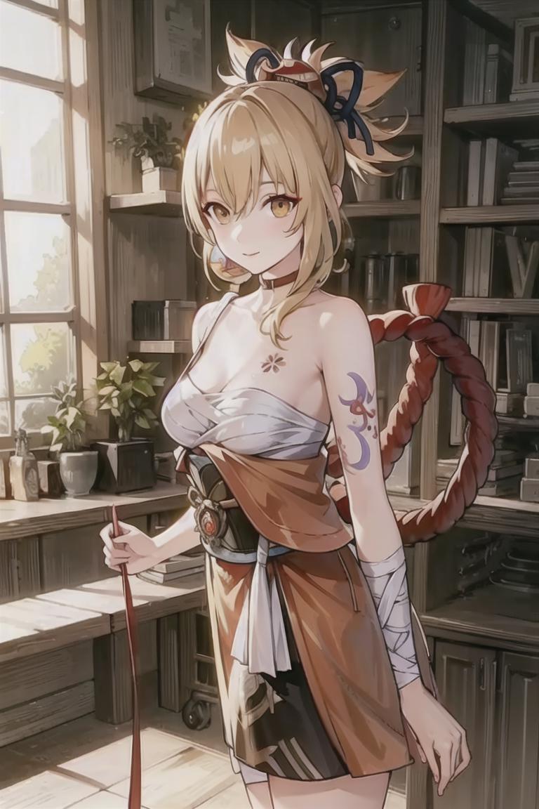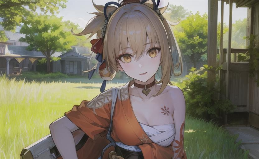 If you want a closeup photo, using yoimiya \(genshin impact\),blonde hair,ponytail would be enough.