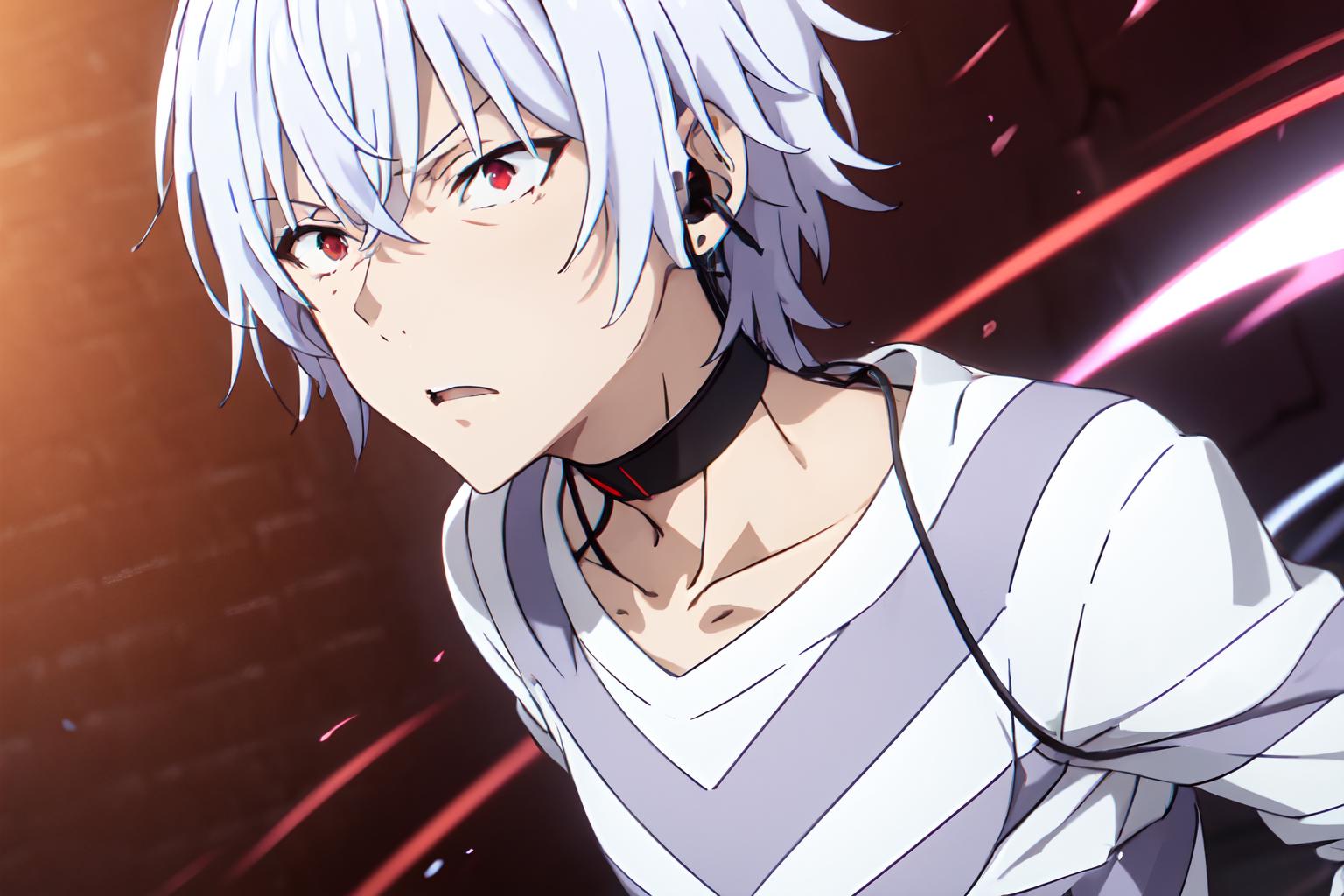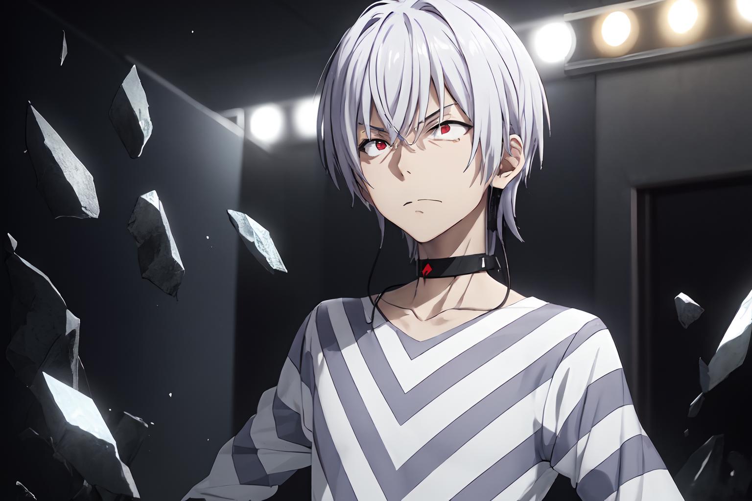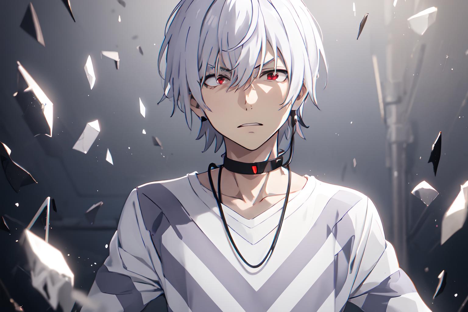 触发词:pha accelerator, 1boy, red eyes, accelerator (toaru majutsu no index), constricted pupils, white hair, shirt, solo, choker, striped shirt, striped, albino, earphones, pants, hair between eyes, short hair, collarbone, white shirt