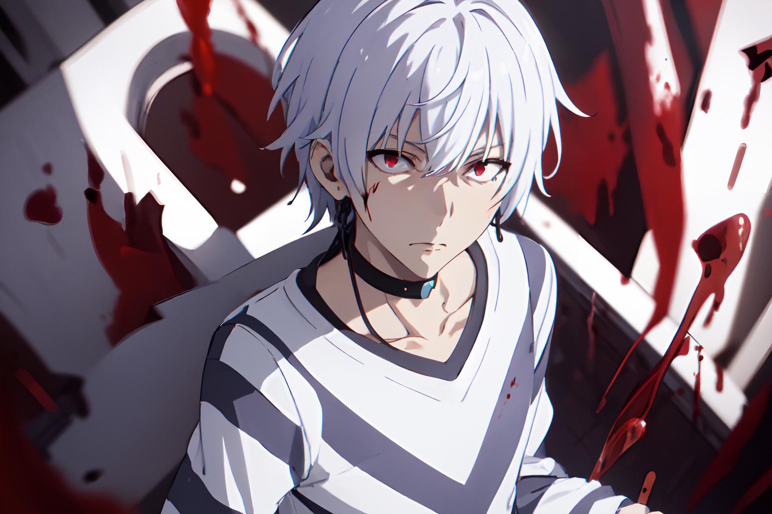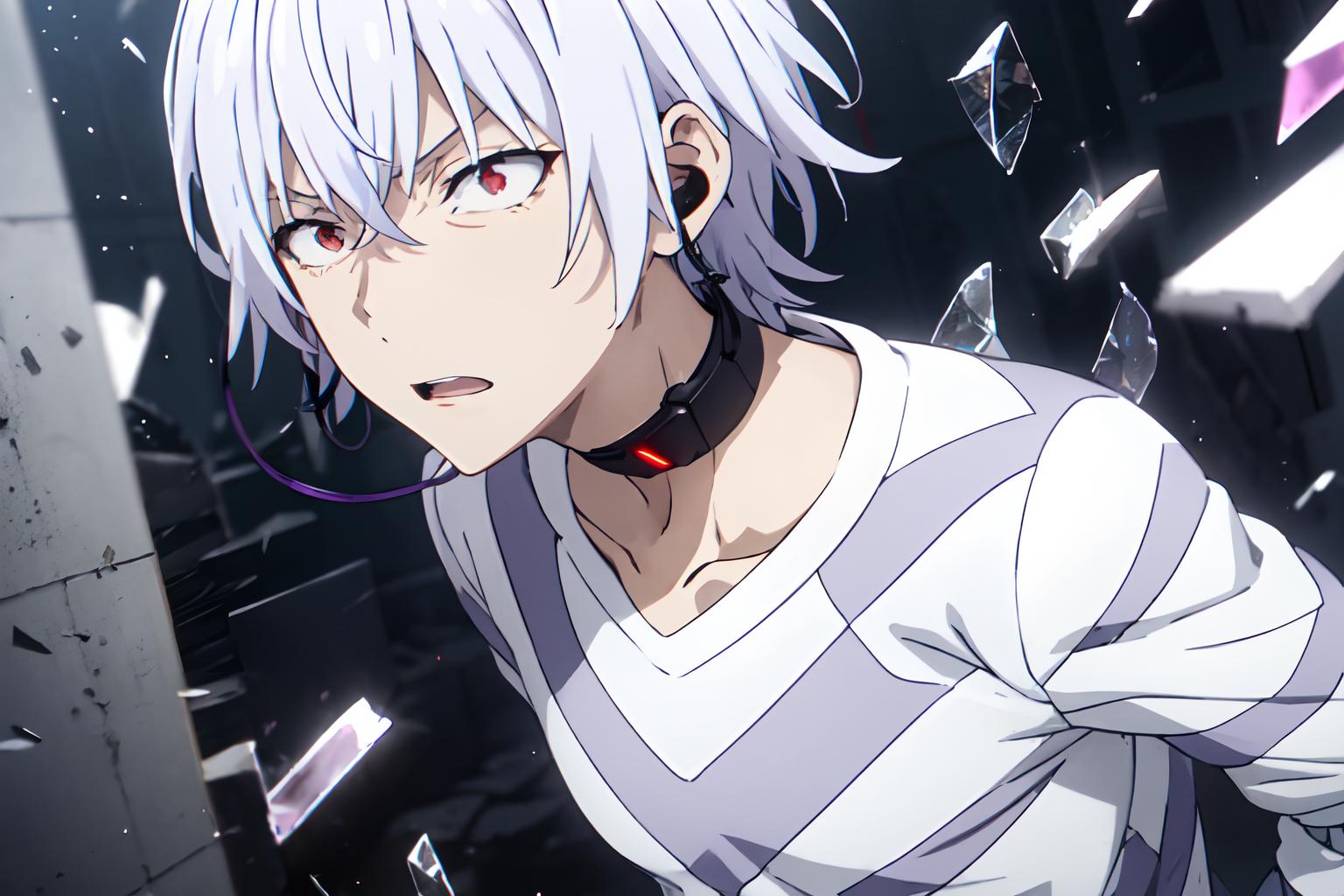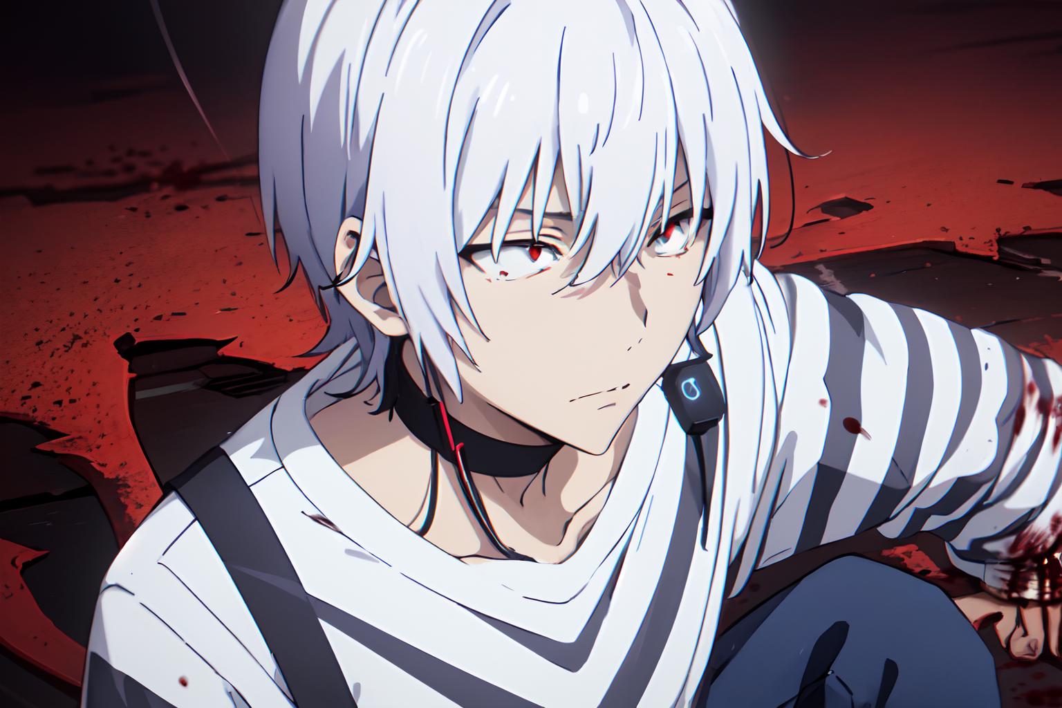 触发词:pha accelerator, 1boy, red eyes, accelerator (toaru majutsu no index), constricted pupils, white hair, shirt, solo, choker, striped shirt, striped, albino, earphones, pants, hair between eyes, short hair, collarbone, white shirt
