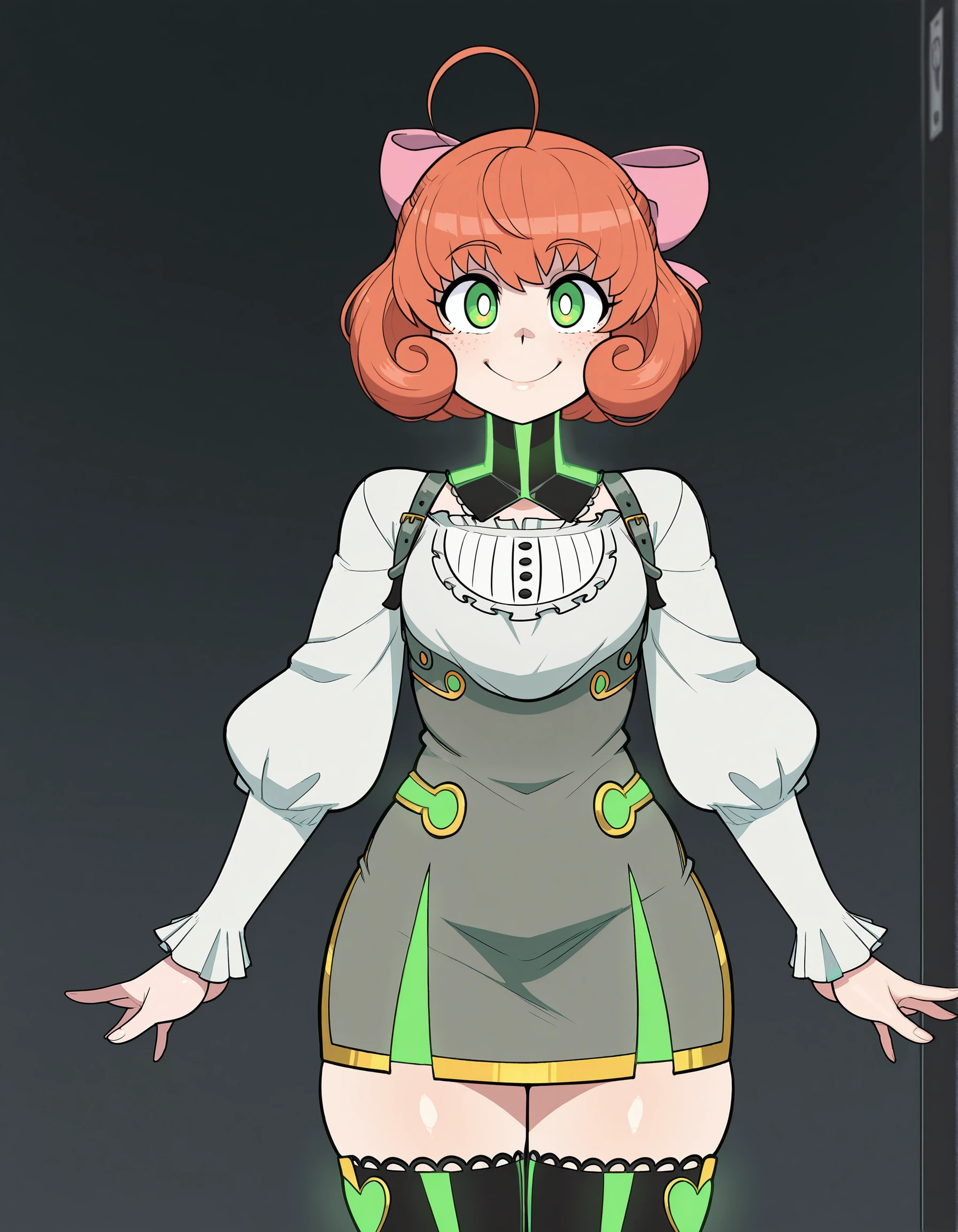 Penny Polendina, short hair, gorget, grey dress, short dress, pencil skirt, neon trim, gold trim, white blouse, long sleeves, black thighhighs, pink bow