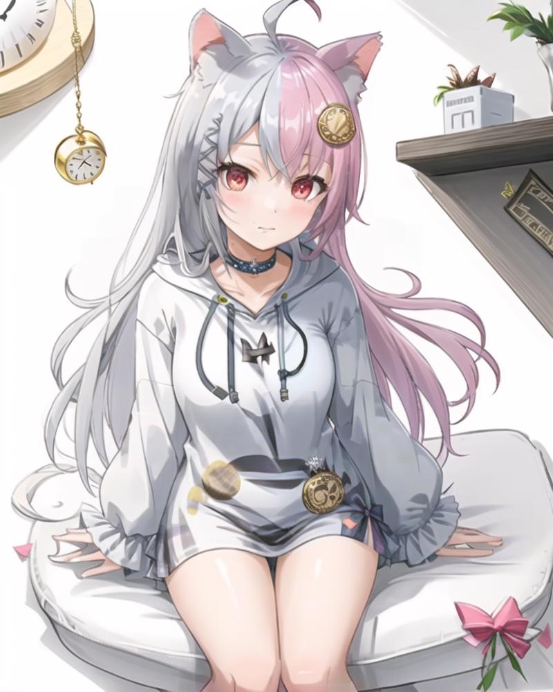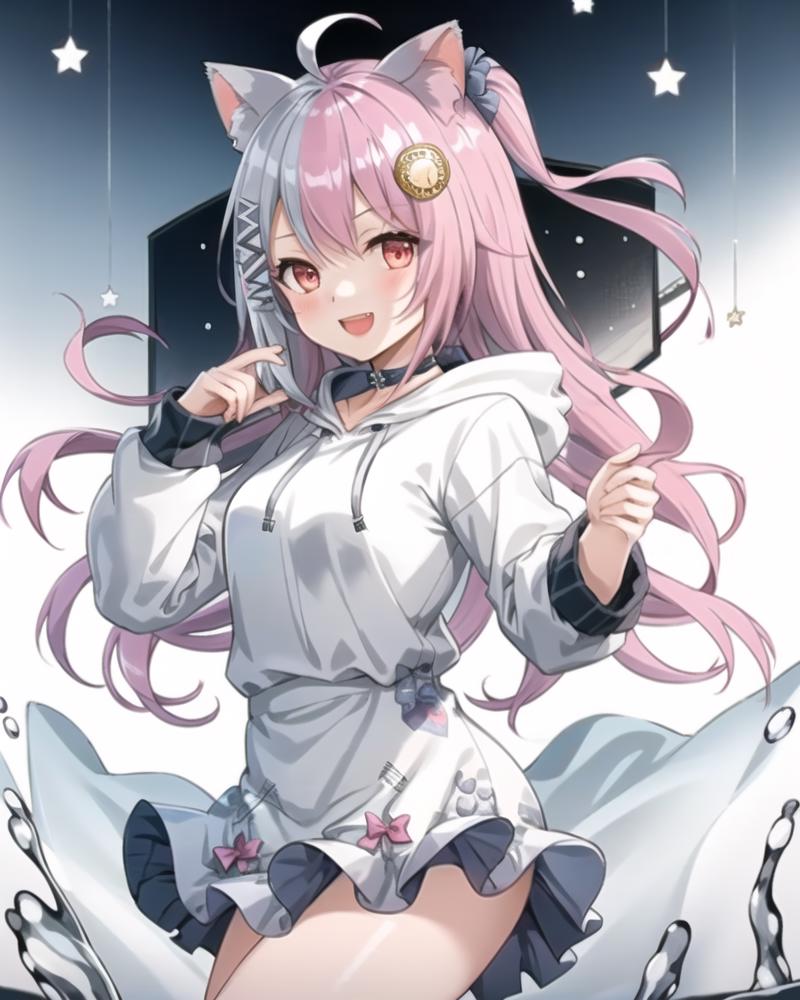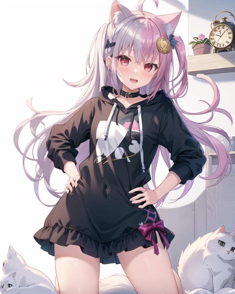 1girl, pom_pom_\(clothes\), hood, animal_ears, clock, hoodie, open_mouth, long_hair, virtual_youtuber, hair_ornament, tail, smile, ahoge, hood_down, pink_hair, cat_tail, cat_ears, looking_at_viewer