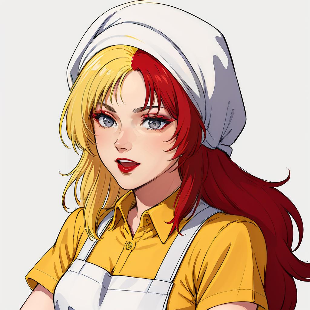 long hair,multicolored hair,two-tone hair,split-color hair,blonde hair,red hair,makeup,grey eyes,lipstick,