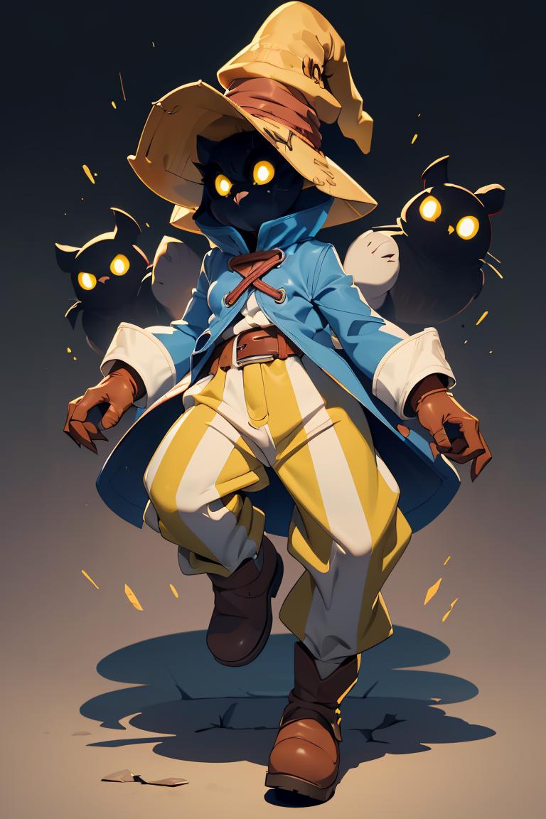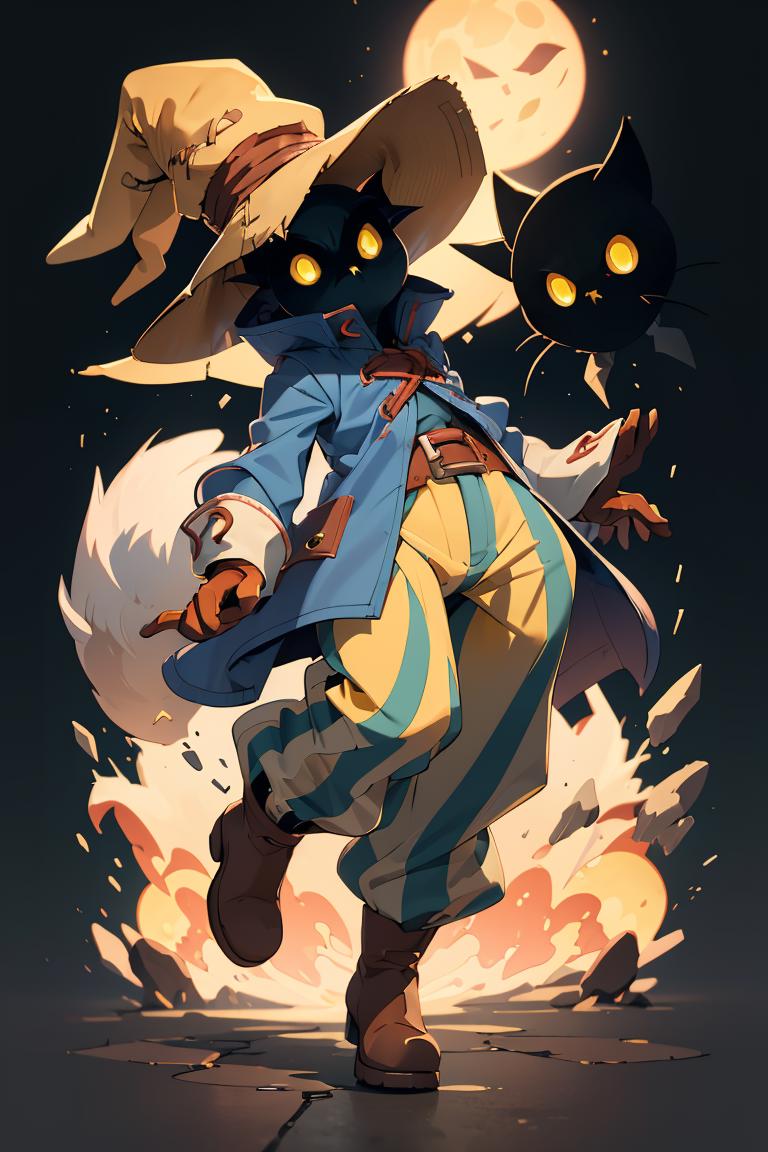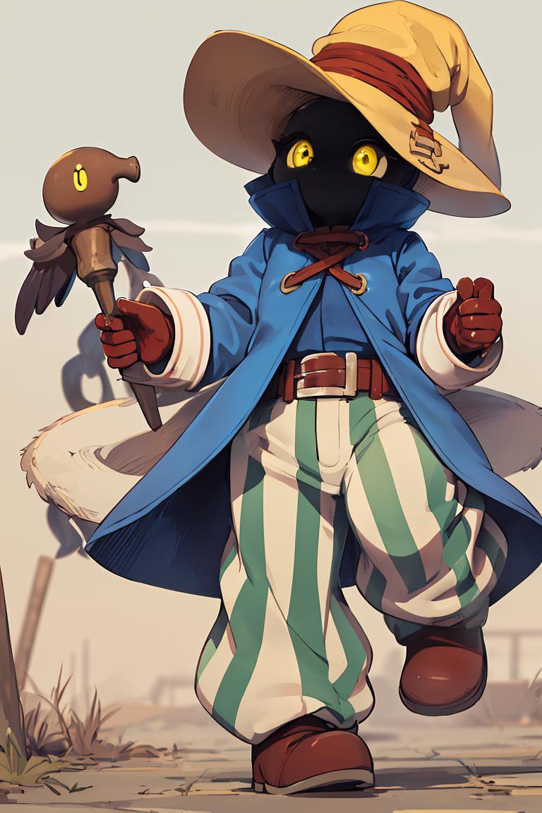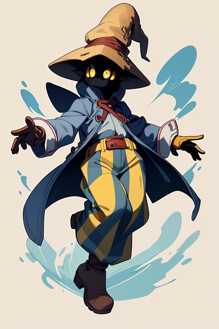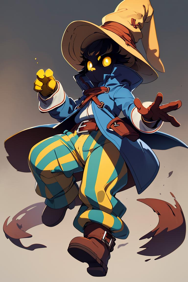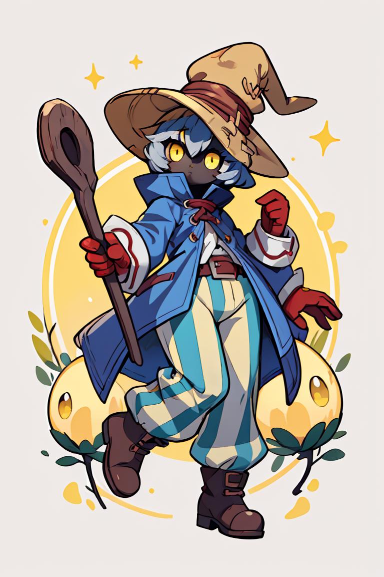 vivi ornitier, baggy pants, belt buckle, blue coat, boots, brown footwear, brown gloves, buckle, coat, gloves, hat, hat belt, high collar, pants, striped, striped pants, wizard hat, (yellow eyes:1.5), yellow headwear,
