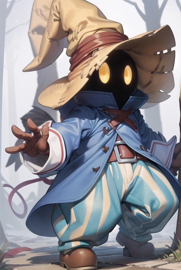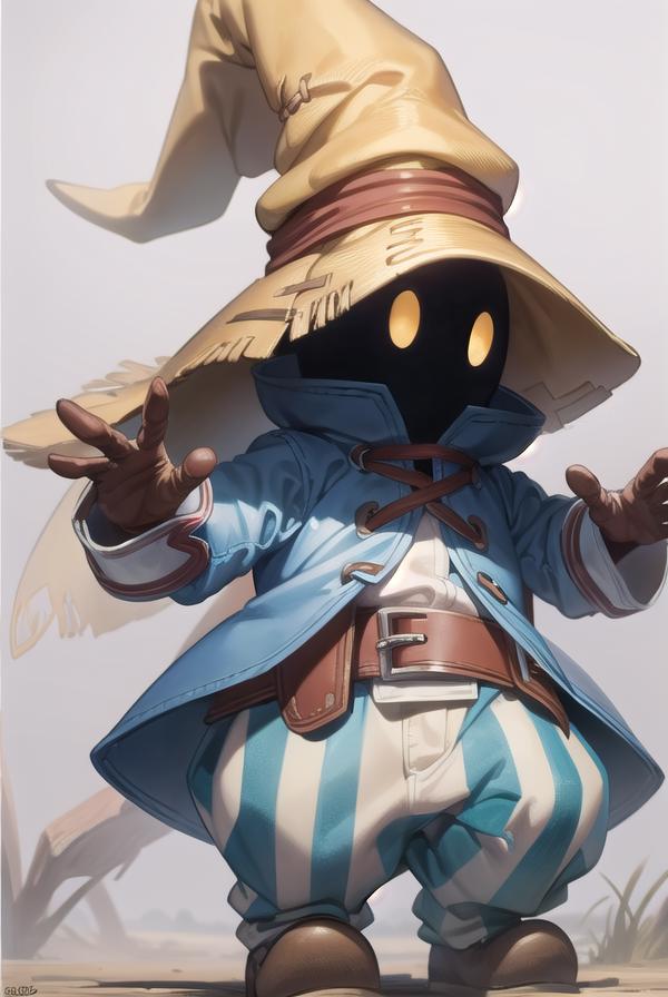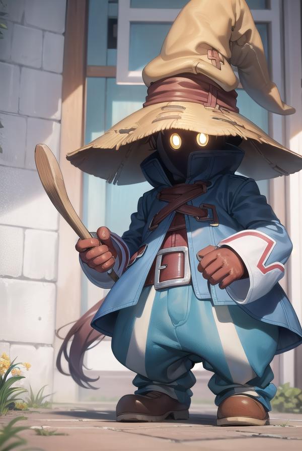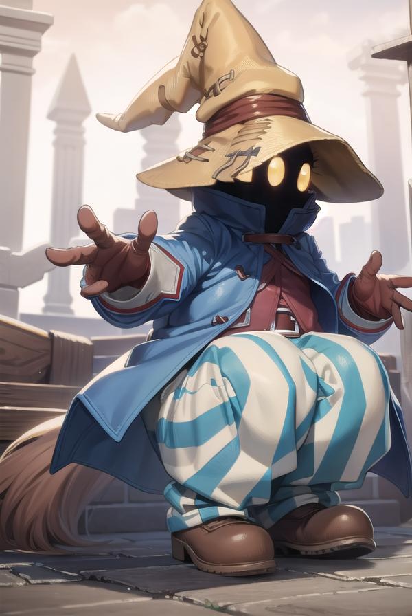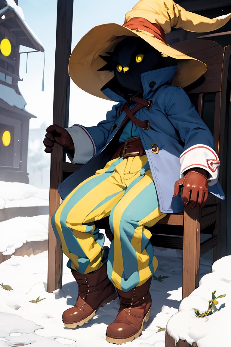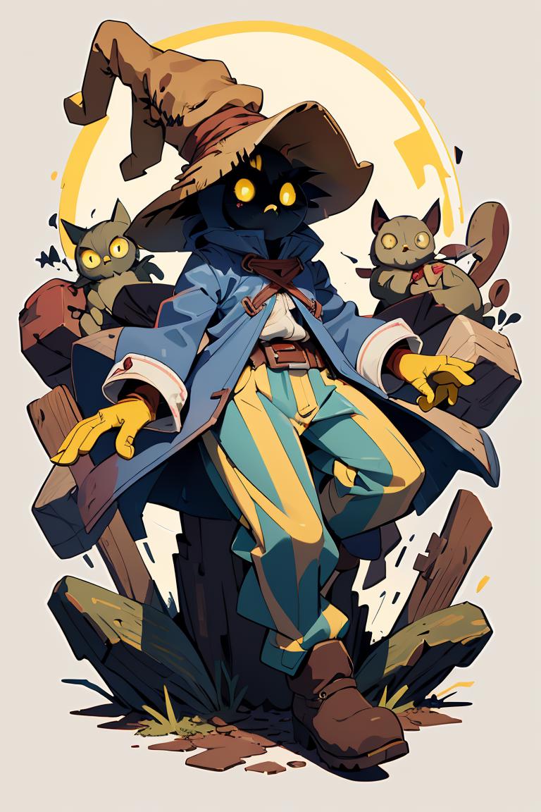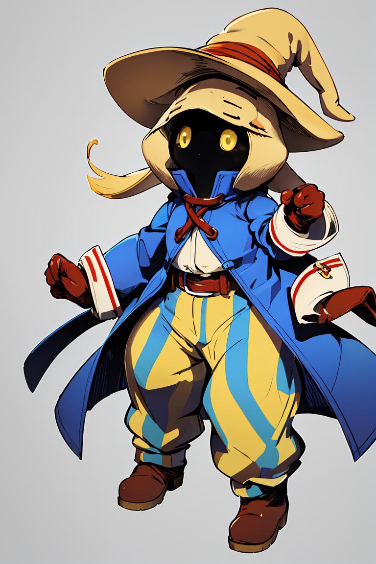 vivi ornitier, baggy pants, belt buckle, blue coat, boots, brown footwear, brown gloves, buckle, coat, gloves, hat, hat belt, high collar, pants, striped, striped pants, wizard hat, (yellow eyes:1.5), yellow headwear,