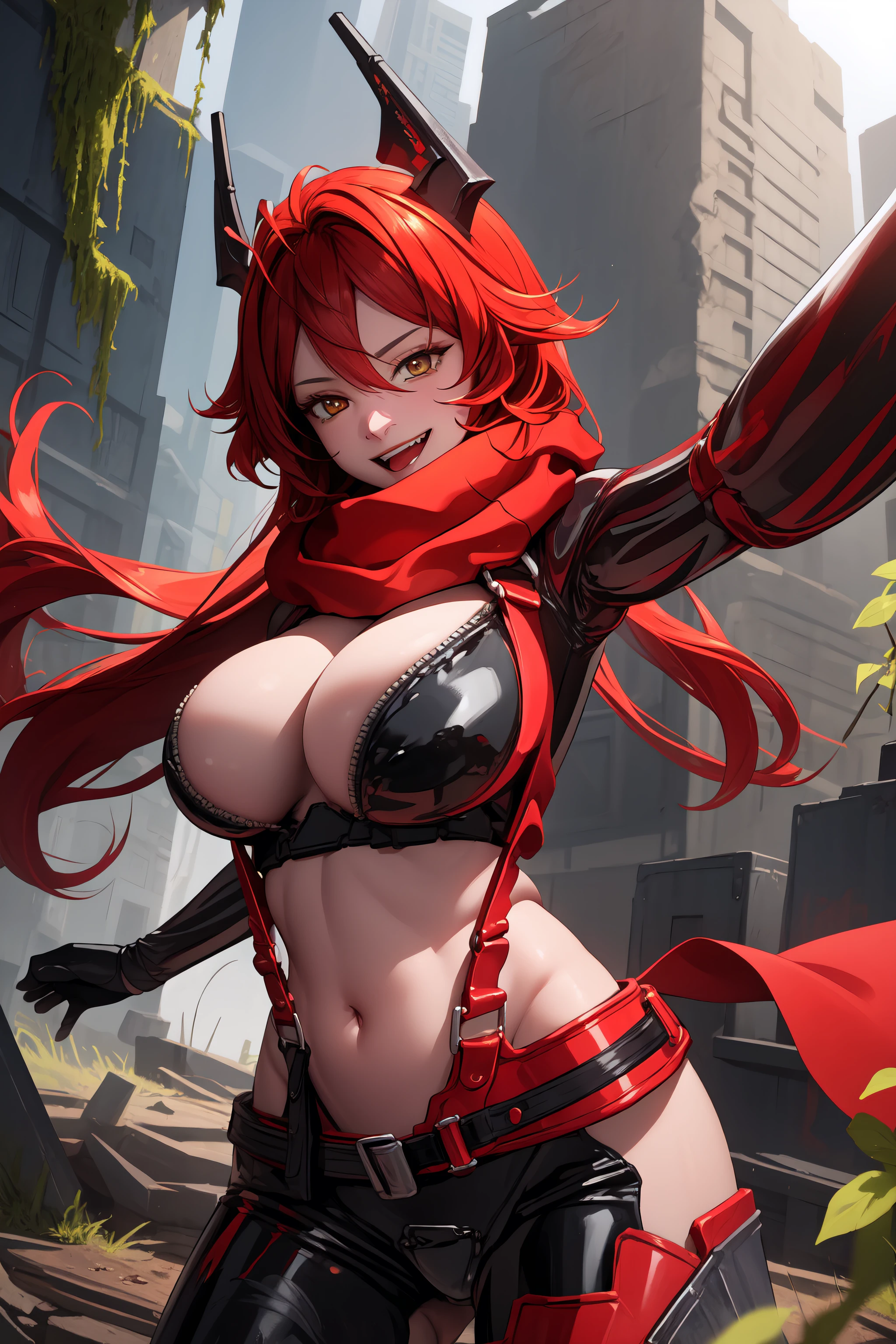 red jacket, cropped jacket, red scarf, unzipped bodysuit, suspenders, black pants, belt, fingerless gloves, asymmetrical legwear, hip vent, midriff, high heel boots