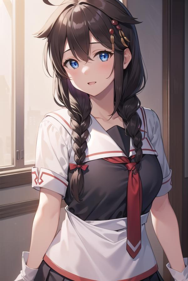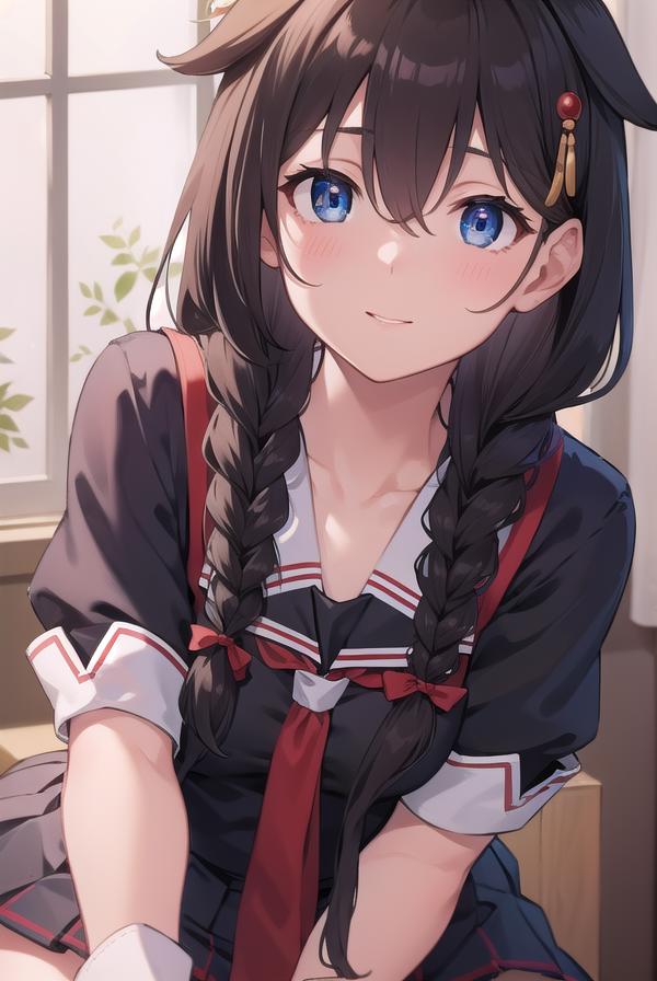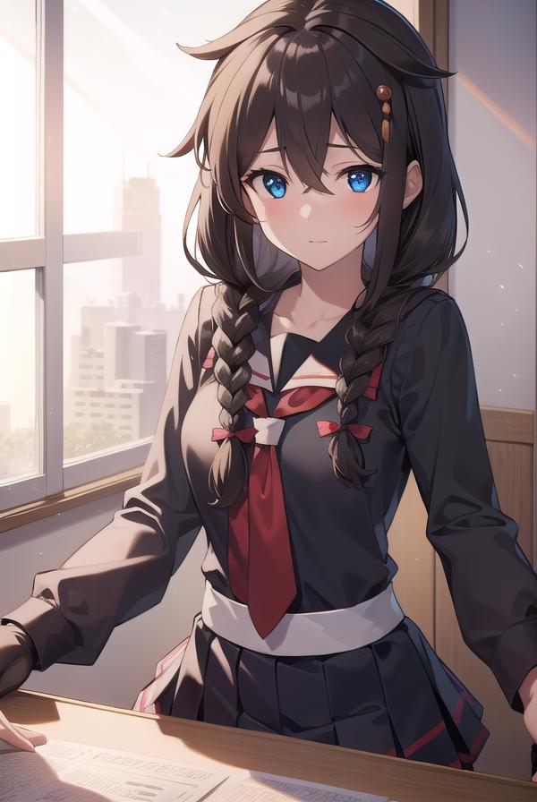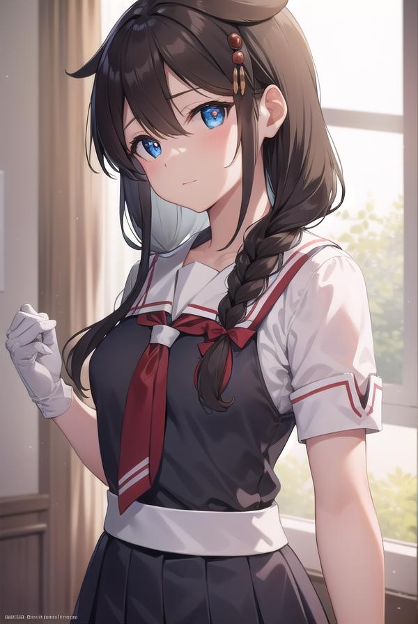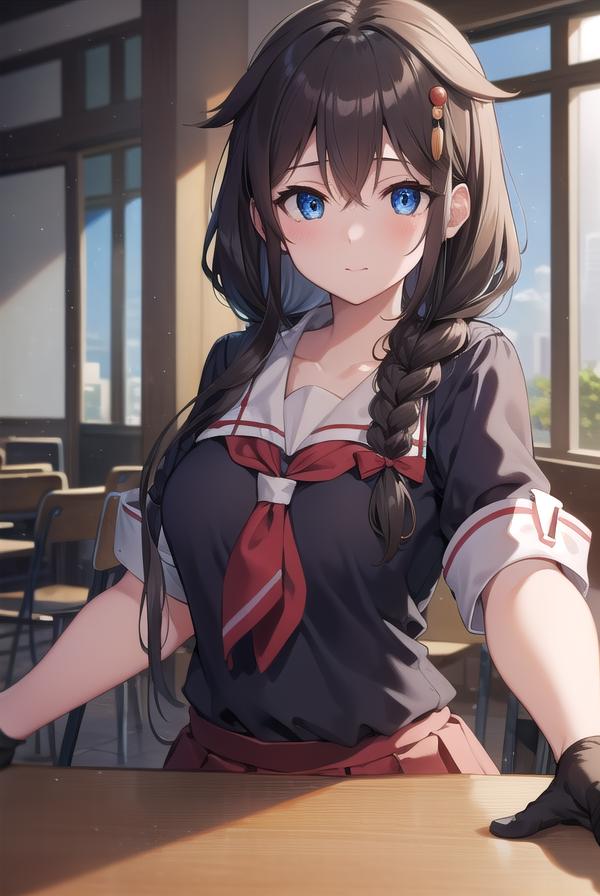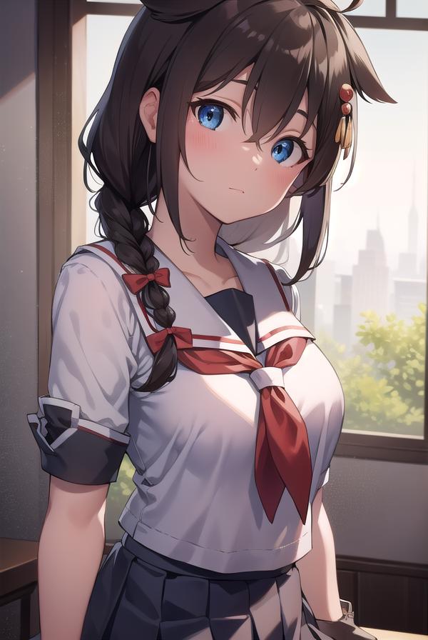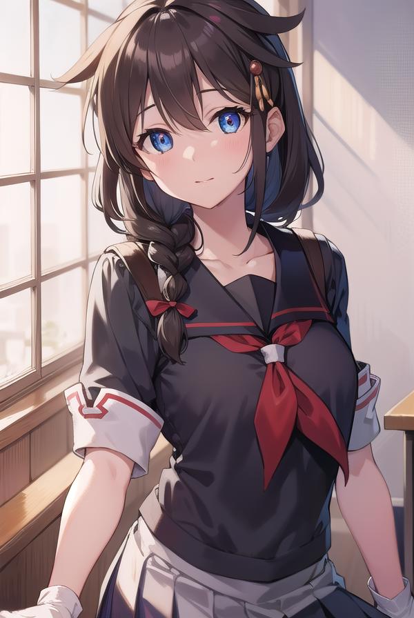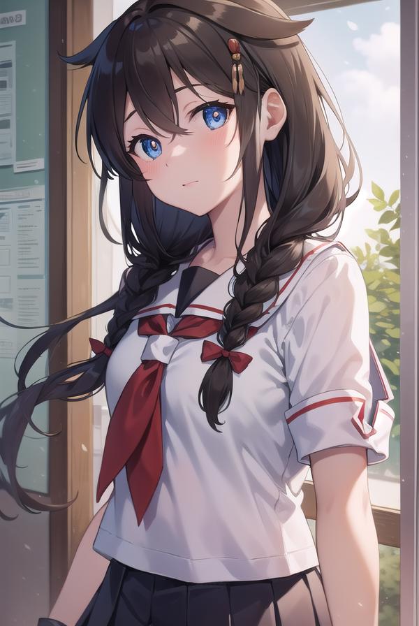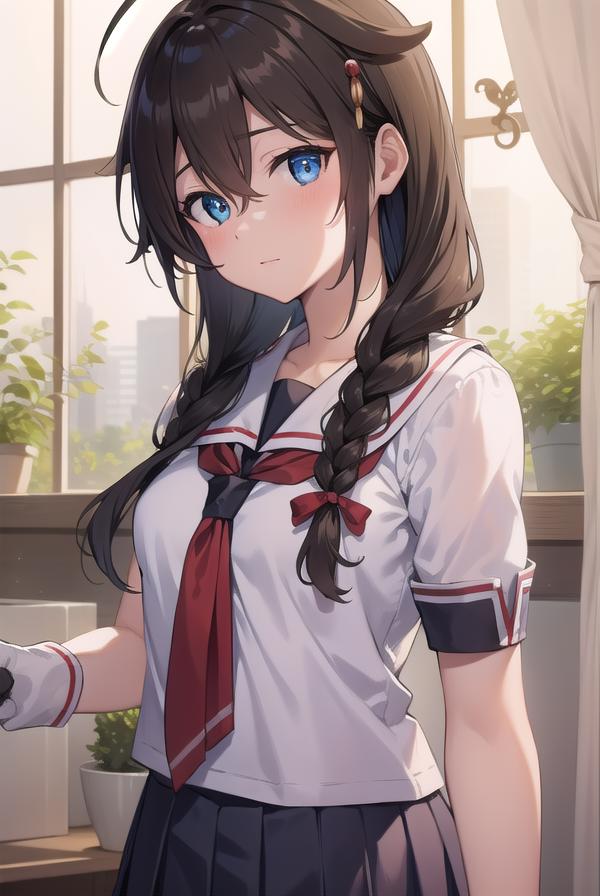 shigure, ahoge, brown hair, blue eyes, braid, hair ornament, hair over shoulder, long hair, single braid, hair flaps,