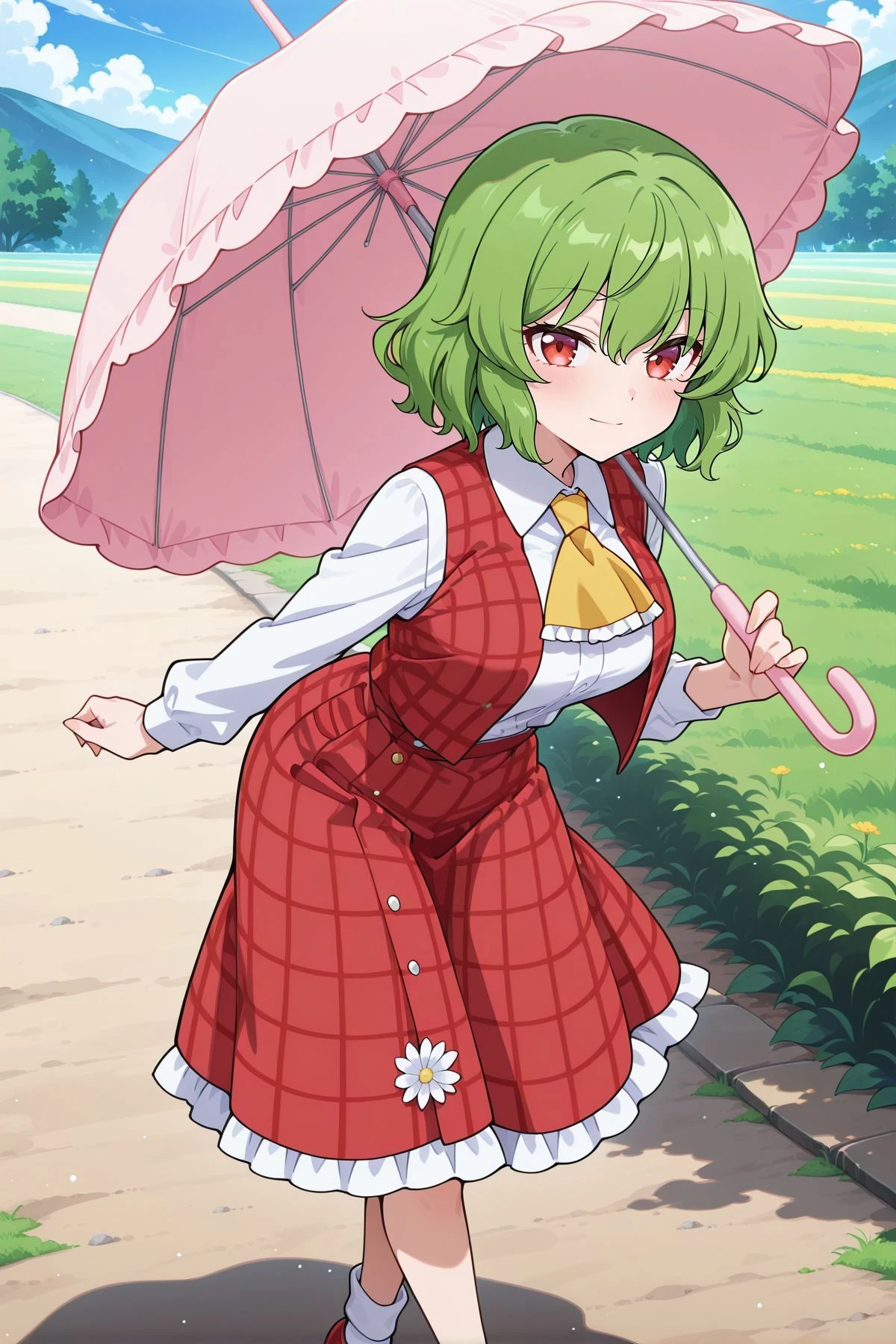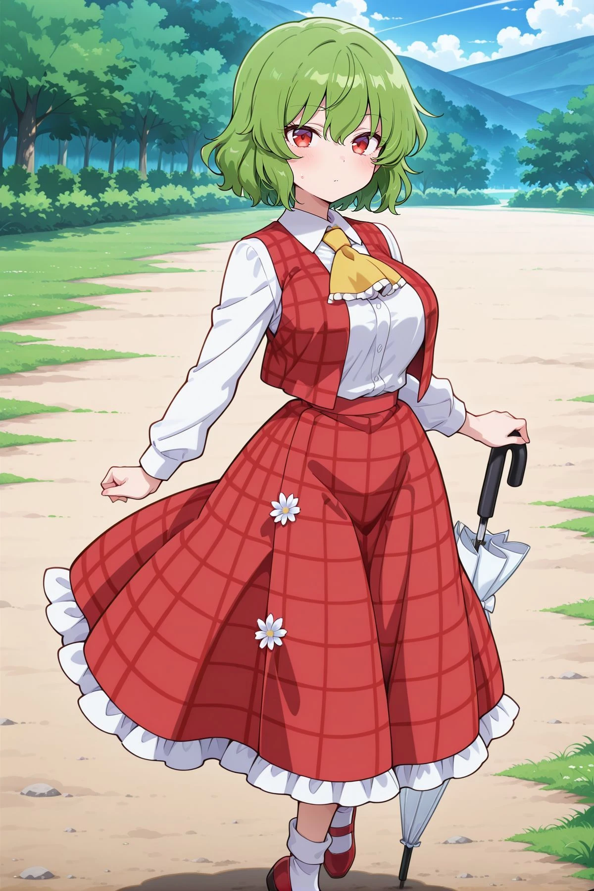 kazami yuuka, 1girl, solo, green eyes, green hair, medium hair, wavy hair,, kazami yuuka \(pc-98\), kazami yuuka \(scarlet\), alternate costume, yellow ascot, red vest, plaid vest, open vest, white shirt, puffy long sleeves, red skirt, plaid skirt, long skirt, white socks, holding umbrella, pink umbrella,