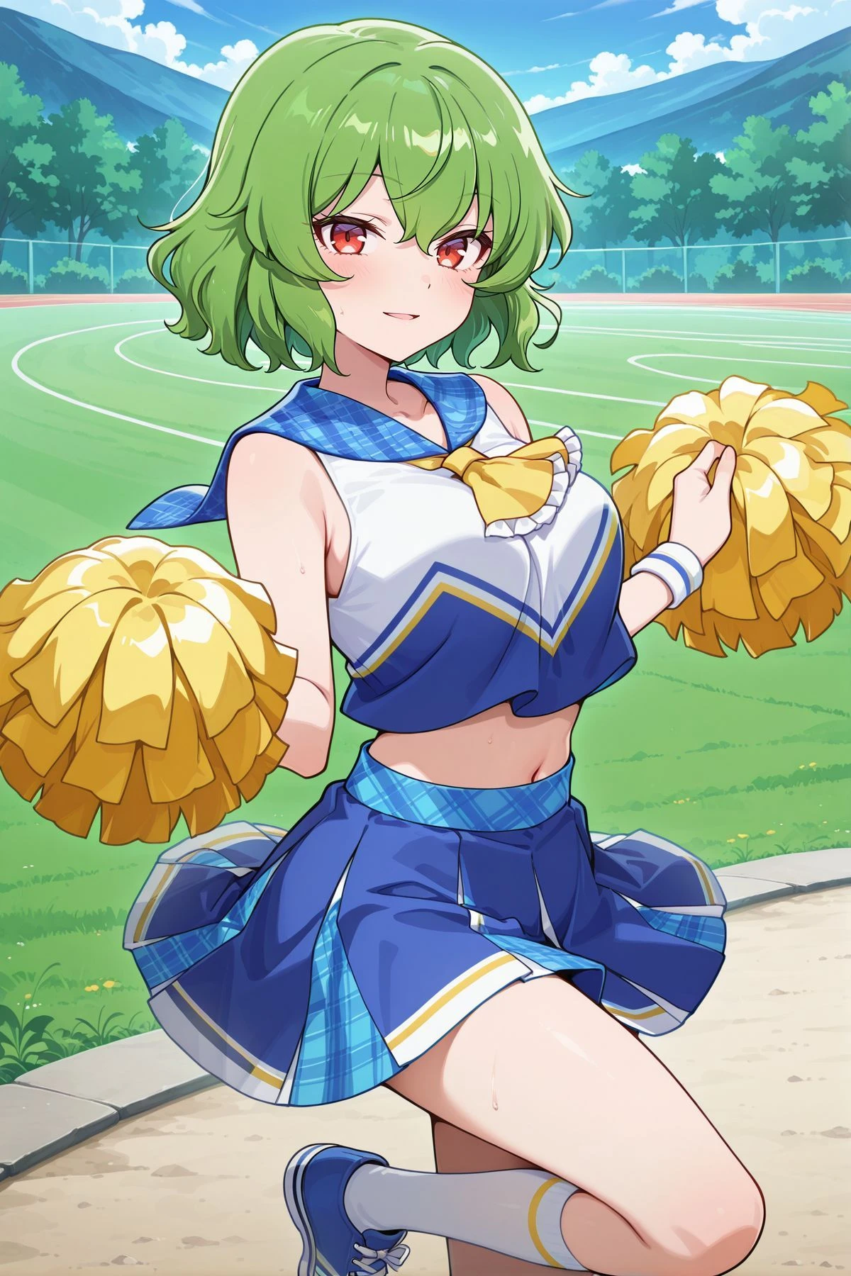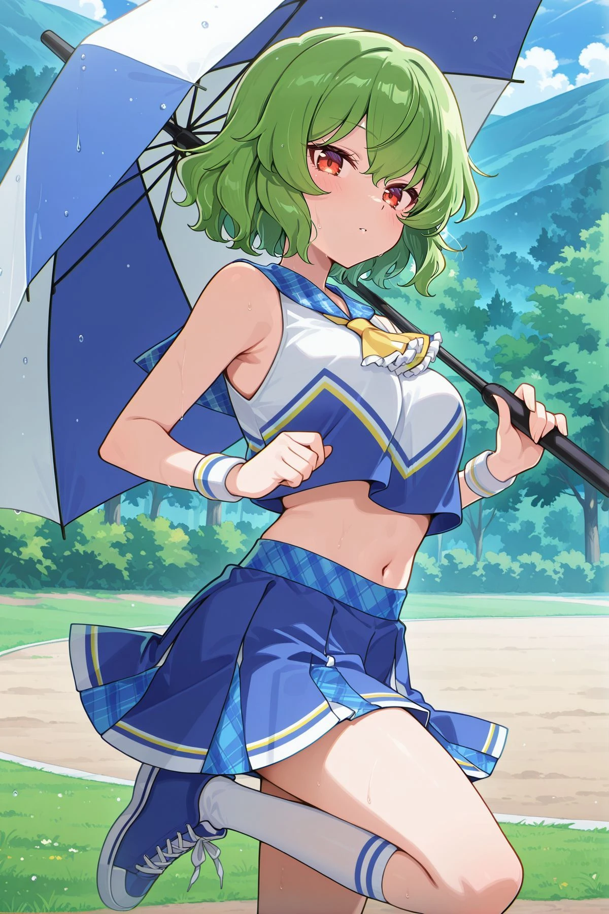 kazami yuuka, 1girl, solo, red eyes, green hair, short hair,, kazami yuuka \(cheerleader of the four seasons\), alternate costume, cheerleader, yellow ascot, frilled ascot, two-tone crop top, white crop top, blue crop top, navel, white wristband, two-tone skirt, blue skirt, plaid skirt, white skirt, kneehighs, white socks, blue shoes, cross-laced shoes, holding umbrella, two-tone umbrella, blue umbrella, white umbrella,