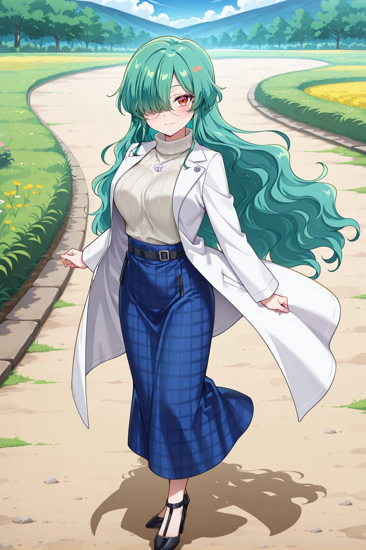 kazami yuuka, 1girl, solo, red eyes, aqua hair, hair over one eye, wavy hair, long hair, glasses, kazami yuuka \(cell-fused kaiju\), alternate costume, alternate hairstyle, blue skirt, long skirt, plaid skirt, flower pin, high heels, lab coat, pendant, plaid clothes, sweater, turtleneck, white sweater,
