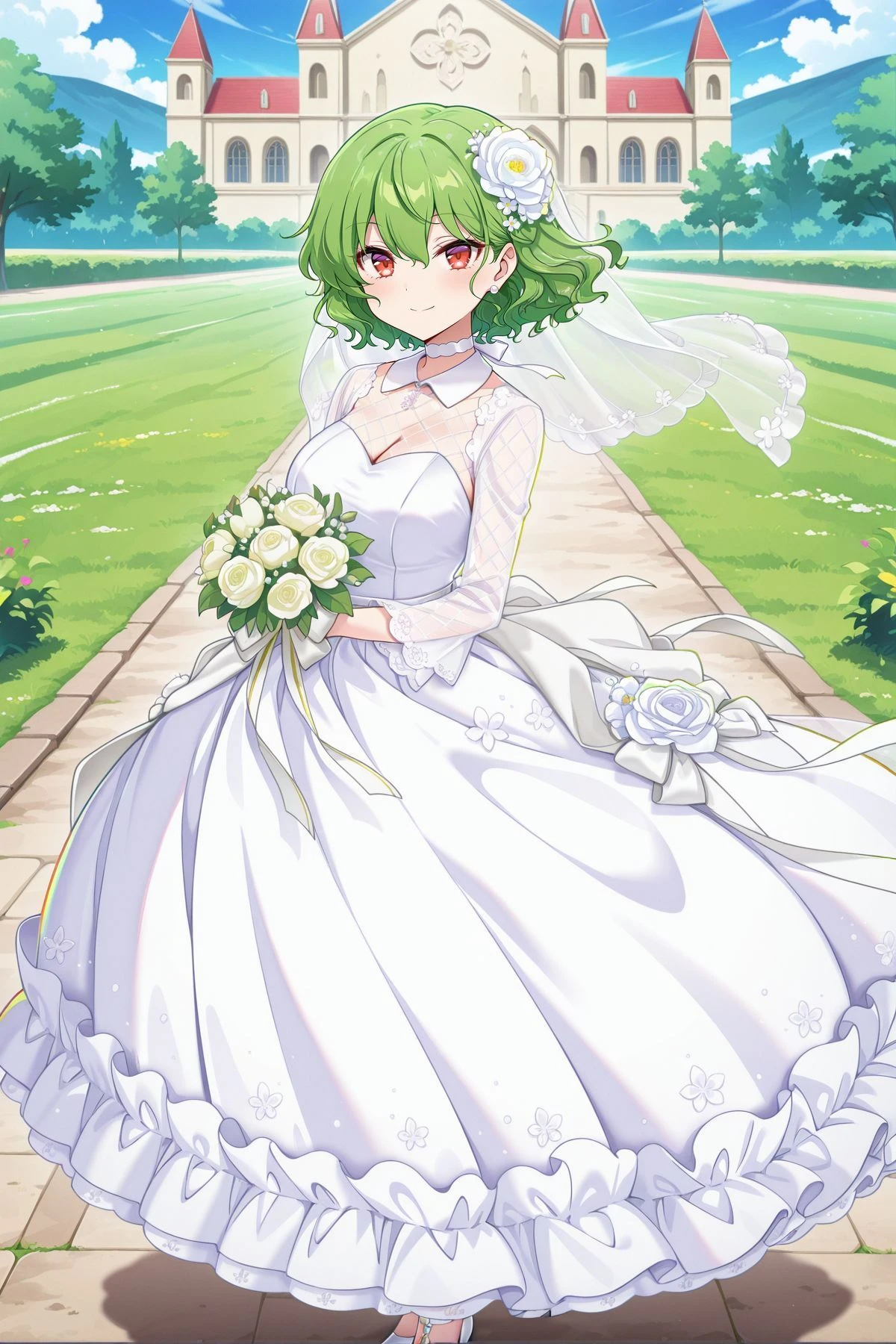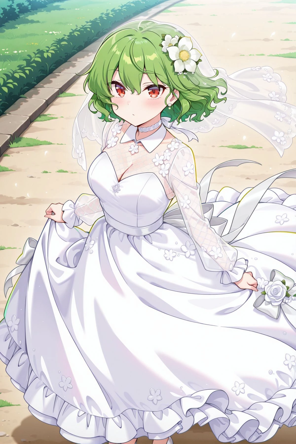 kazami yuuka, 1girl, solo, red eyes, green hair, short hair, curly hair, ???????,, kazami yuuka \(ever-blooming white flower\), alternate costume, bridal veil, see-through veil, hair flower, pearl earrings, white choker, frilled choker, cleavage, detached collar, fishnet top, white dress, wedding dress, long dress, long sleeves, fishnet sleeves, white shoes, high heels,