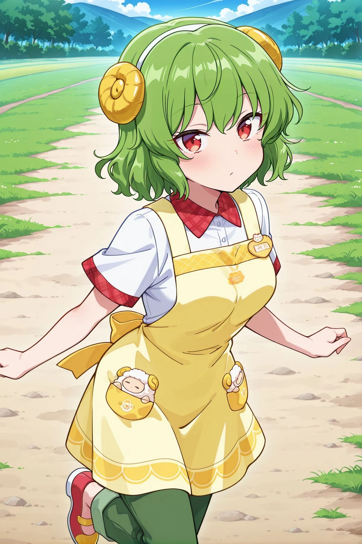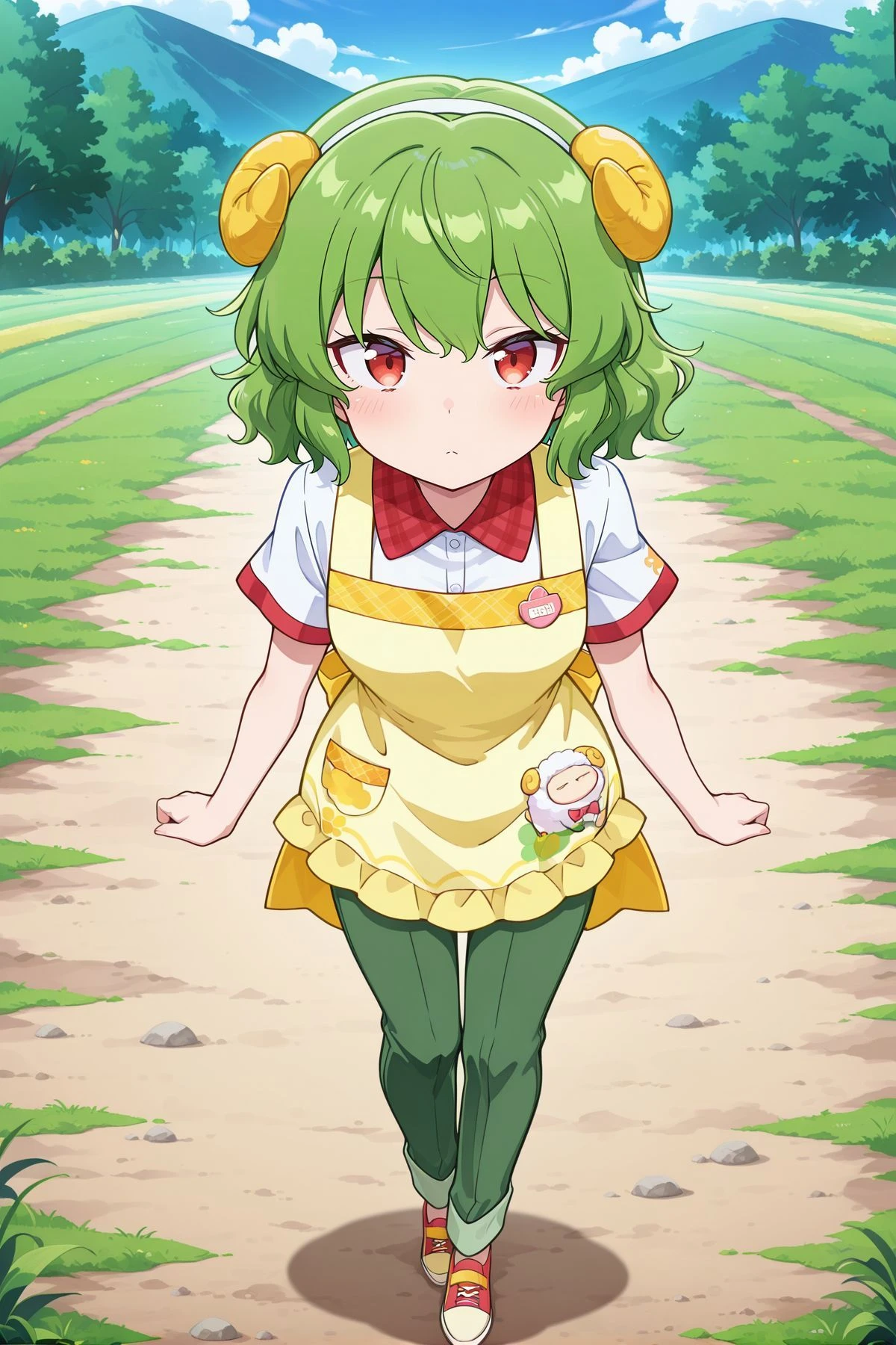 kazami yuuka, 1girl, solo, red eyes, green hair, short hair,, kazami yuuka \(fairy kindergarteners' gardener\), alternate costume, horn hairband, fake sheep horns, white hairband, yellow apron, sheep print apron, apron pocket, plaid collar, collared shirt, white shirt,short sleeves, green pants, two-tone shoes, red shoes, yellow shoes, name tag, stuffed sheep,