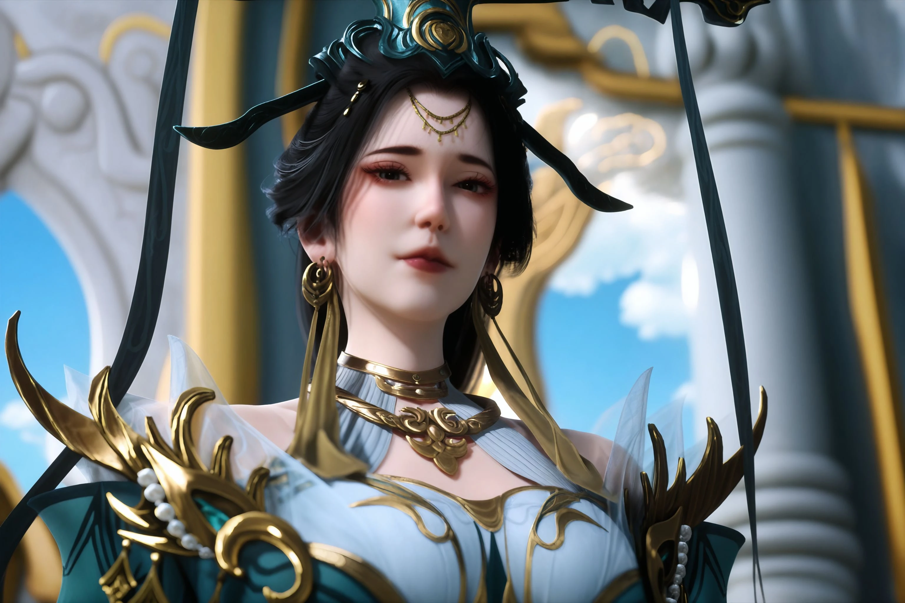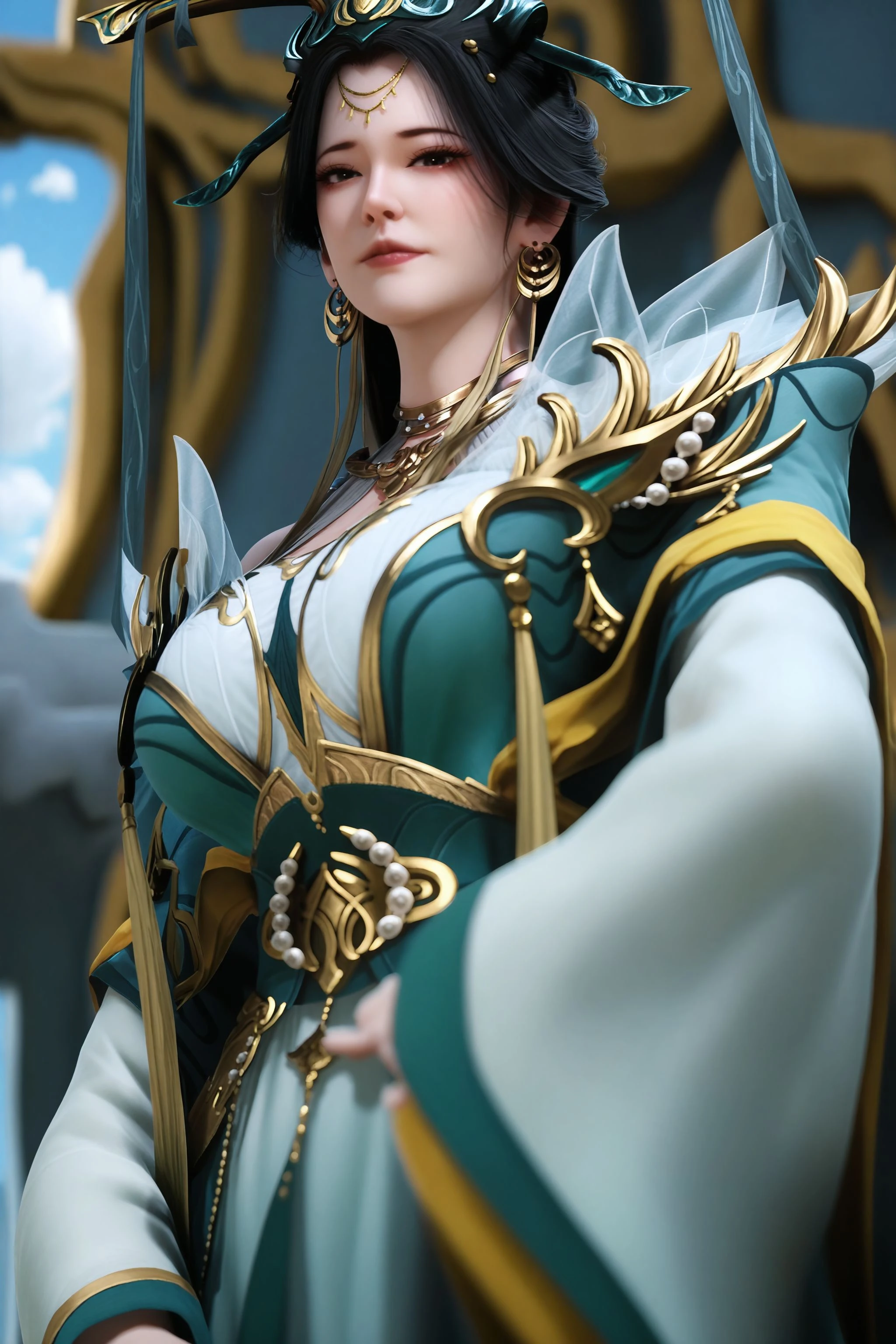 1girl, solo, jewelry, long hair, hair ornament, earrings, chinese clothes, dress, green dress, black hair, long sleeves