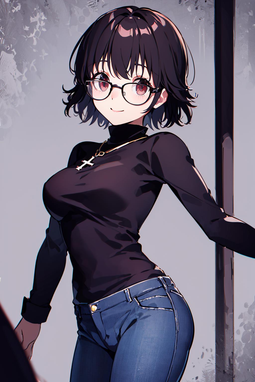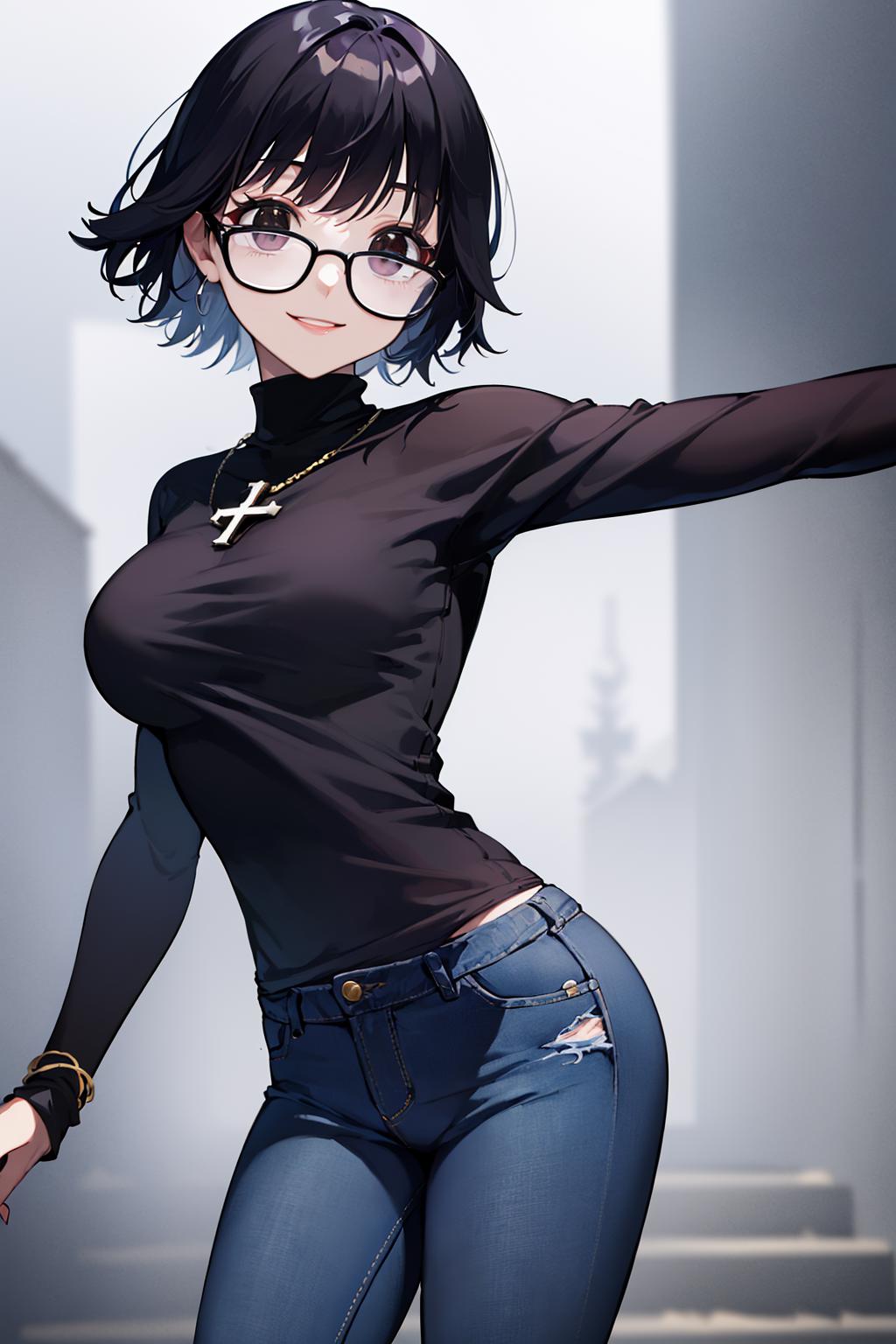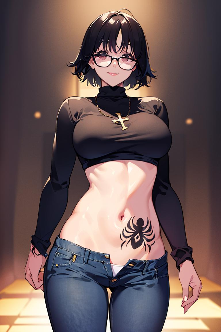 Extra prompts: denim jeans, cross, glasses, stomach tattoo,