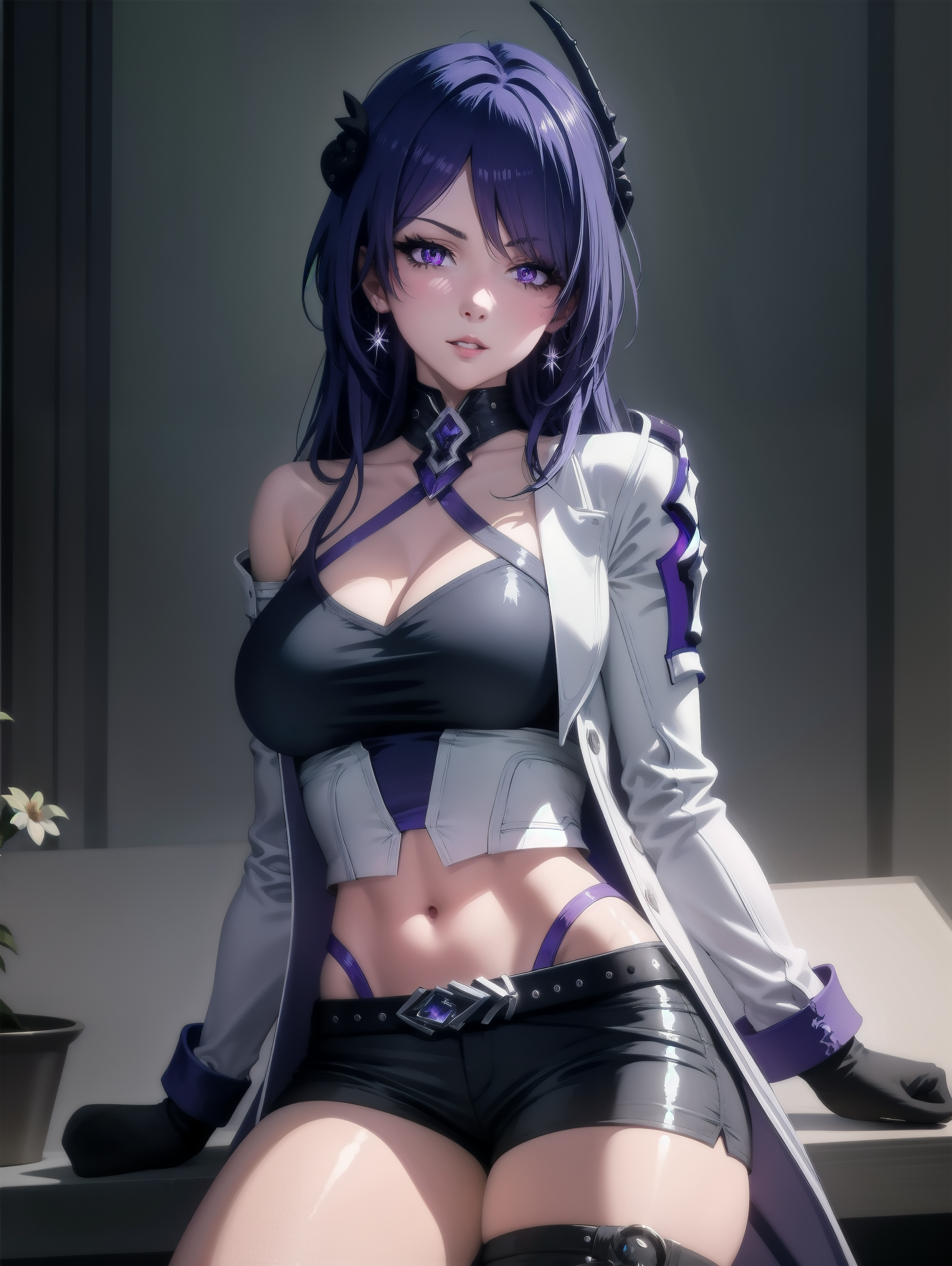 long hair, , looking at viewer, smile, bangs, , thighhighs, gloves, long sleeves, navel, cleavage, shoulders, jewelry, very long hair, purple eyes, weapon, purple hair, flower, thighs, parted lips, horns, shorts, black gloves, elbow gloves, midriff, belt, sword, black thighhighs, hair over one eye, arm up, coat, petals, short shorts, black shorts, white jacket, single thighhigh, archeron