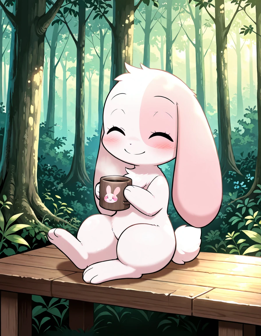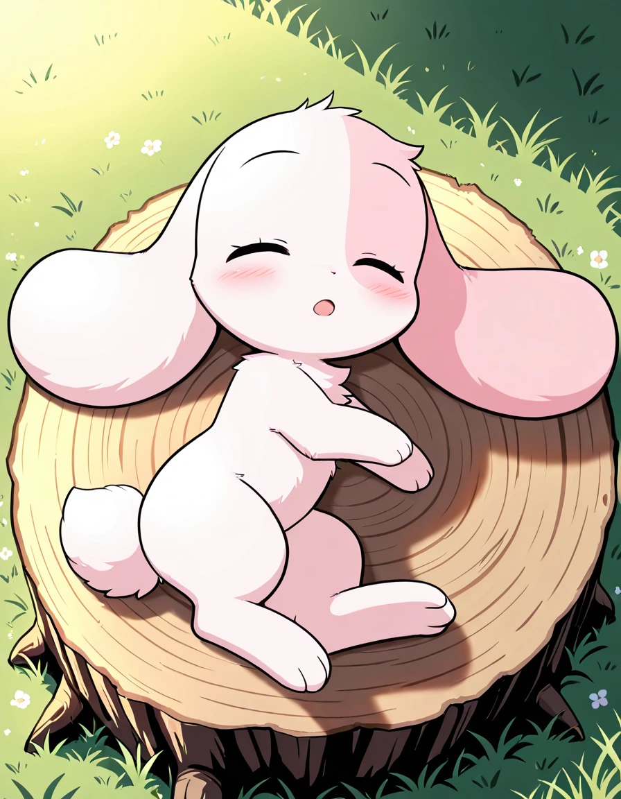 furry, female, lagomorph, droopy ears, chibi, feral, digitigrade, ????? fur, light pink body, (pink patch fur around one eye:0.9), brown eyes