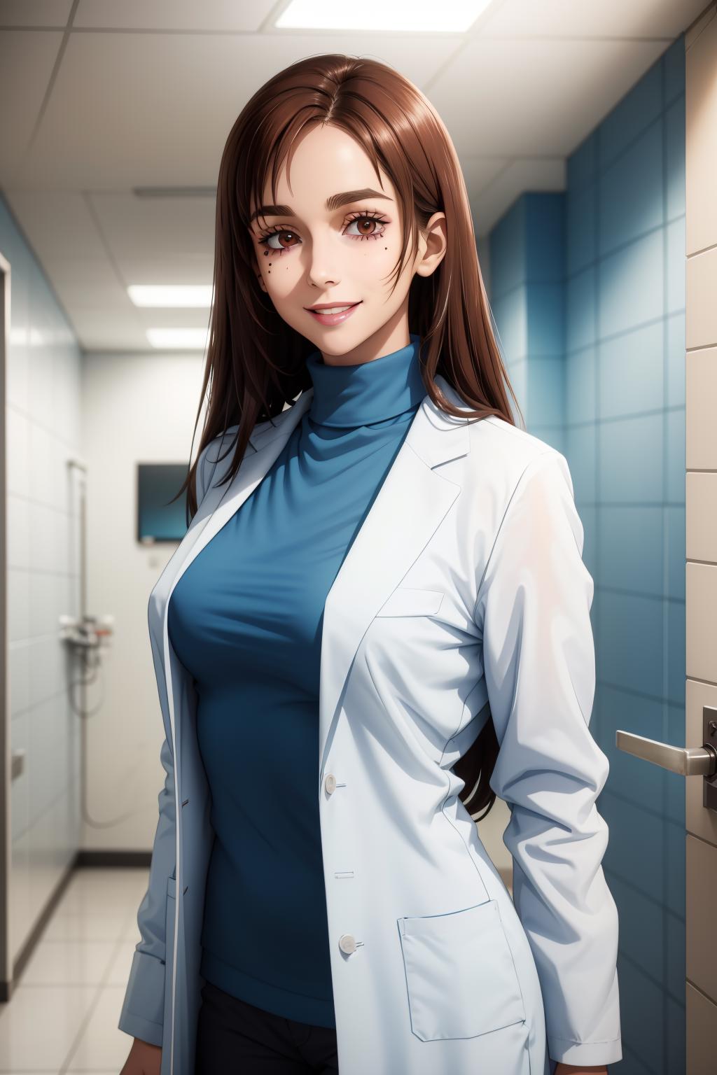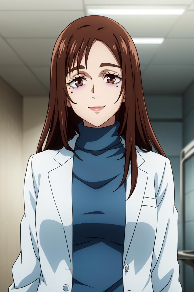 Trigger words : shoko_ieiri, brown hair, brown eyes, eyebags, eyeshadow, makeup, labcoat, blue turtleneck