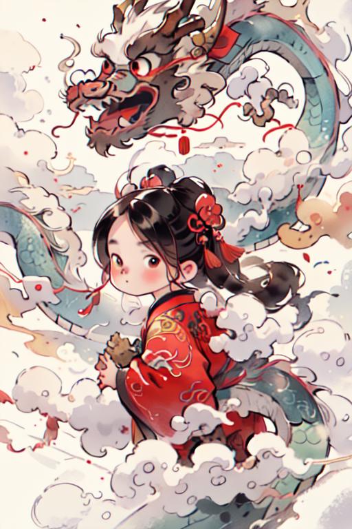 这个LORA提供水墨风的龙画风,擅长画萌娃。不知为什么娃娃的脸的例图不给上传,