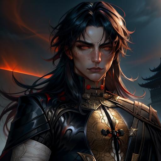 optional tags: male focus, black coat, chinese clothes, bangs,