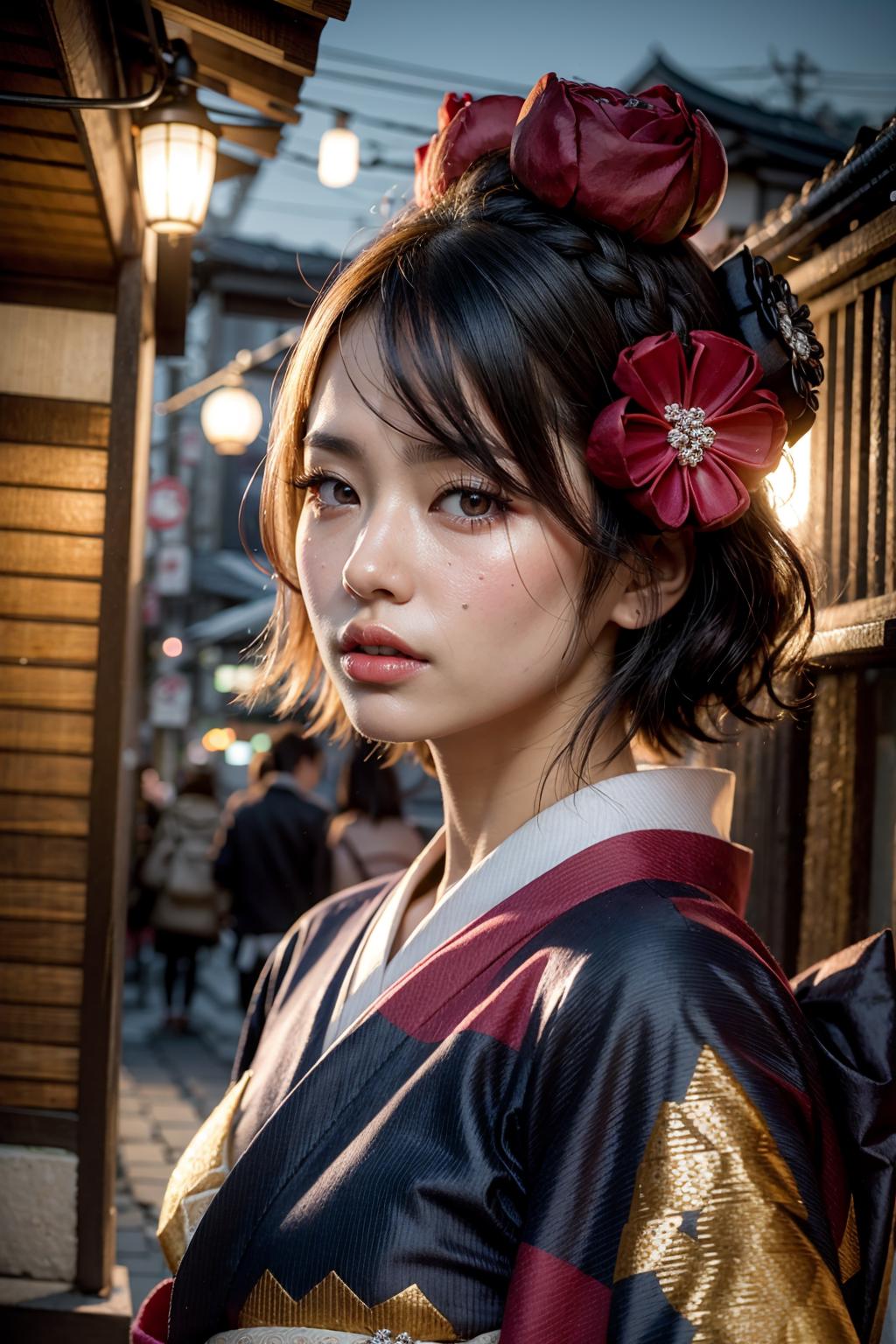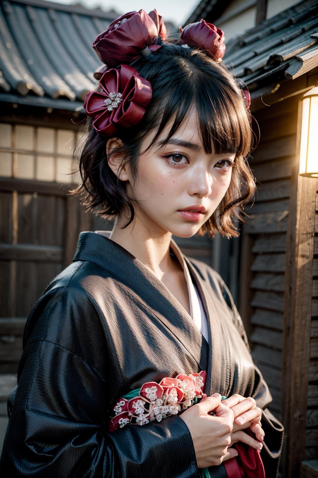 Normal: hokusai, short hair, bangs, (purple eyes:1.1), black hair, hair ornament, purple hair, flower, hair flower, hairpin,