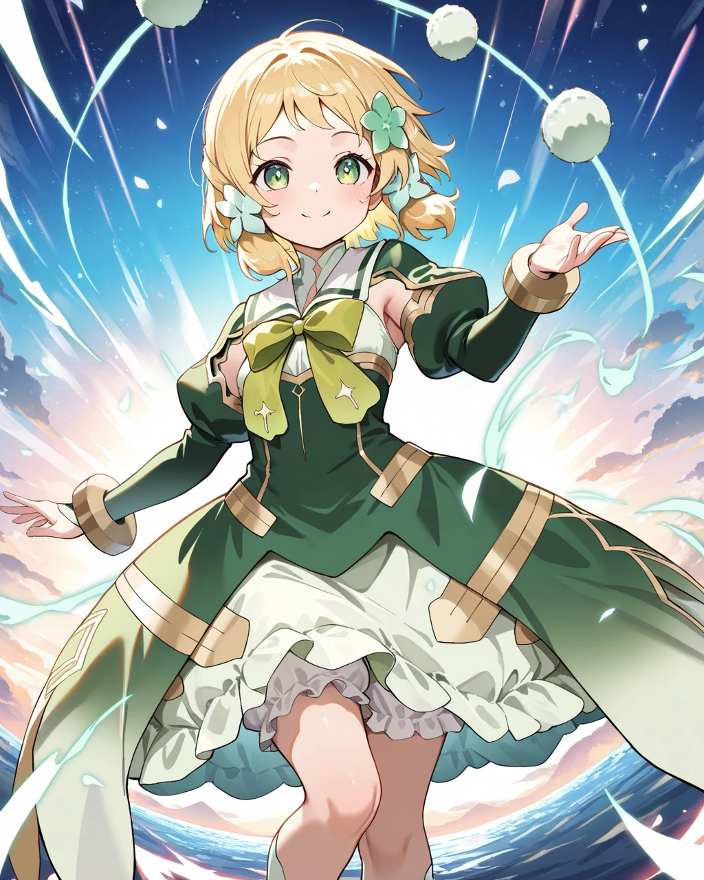 hero form : itsuk hero form,1girl, solo,short hair, green eyes, hair flower, blonde hair,bow, ornament,dress, green dress, bloomers,