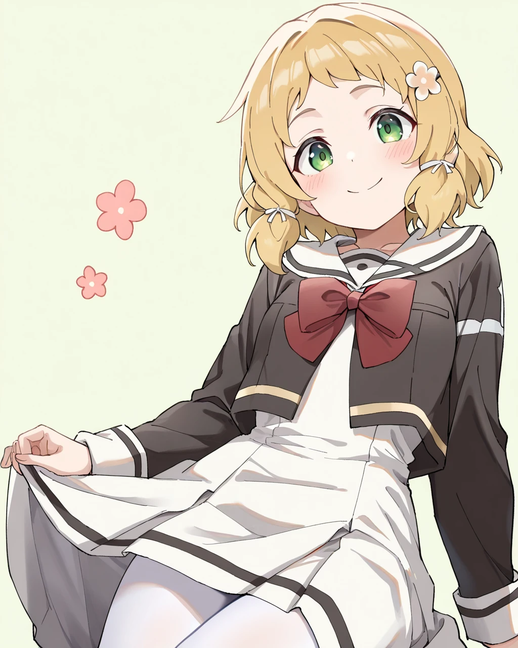 uniform : inubozaki itsuki,1girl, solo,short hair, green eyes, hair flower, blonde hair,skirt,hair ornament,hairclip,bow,dress,black shirt,school uniform, white pantyhose,sailor collar, red bowtie,white dress,