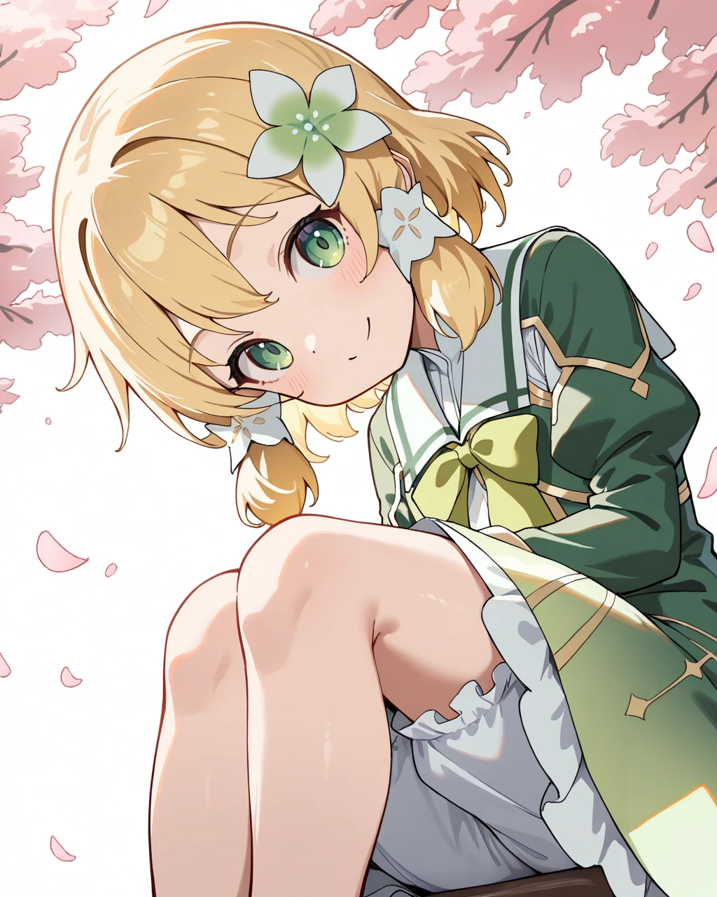 Warrior clothes :1girl, solo,short hair, green eyes, hair flower, blonde hair,bow, ornament,dress, green dress, bloomers,