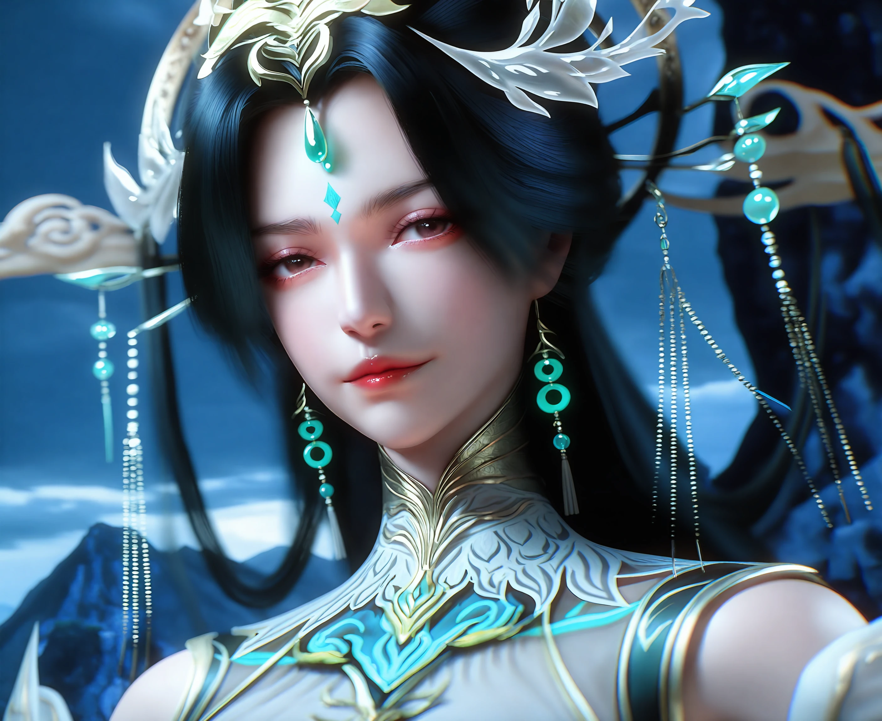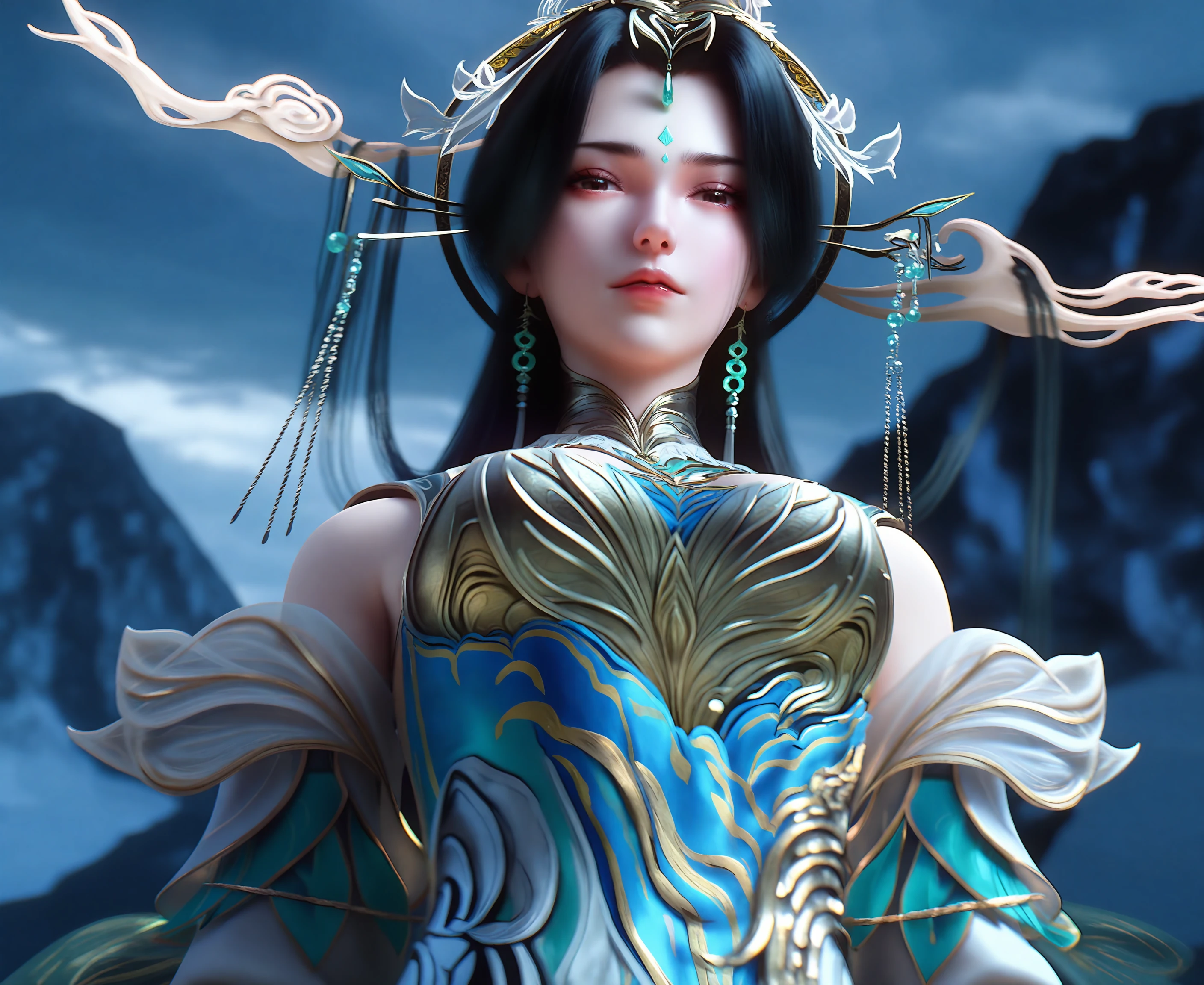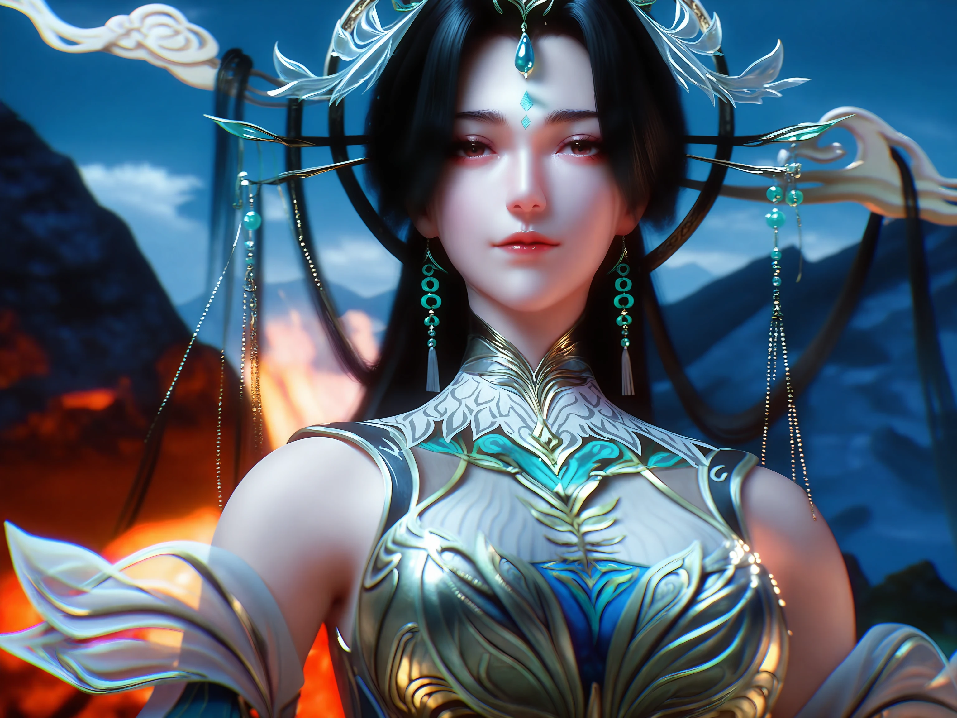 1girl, dress, long hair, hair ornament, black hair, forehead mark chinese clothes, jewelry, ribbon, ribbon trim