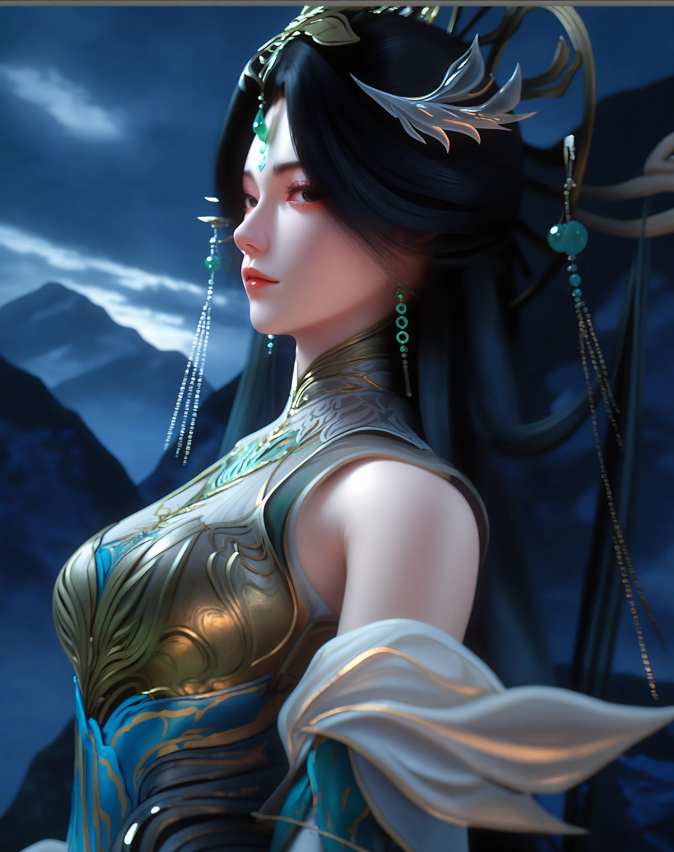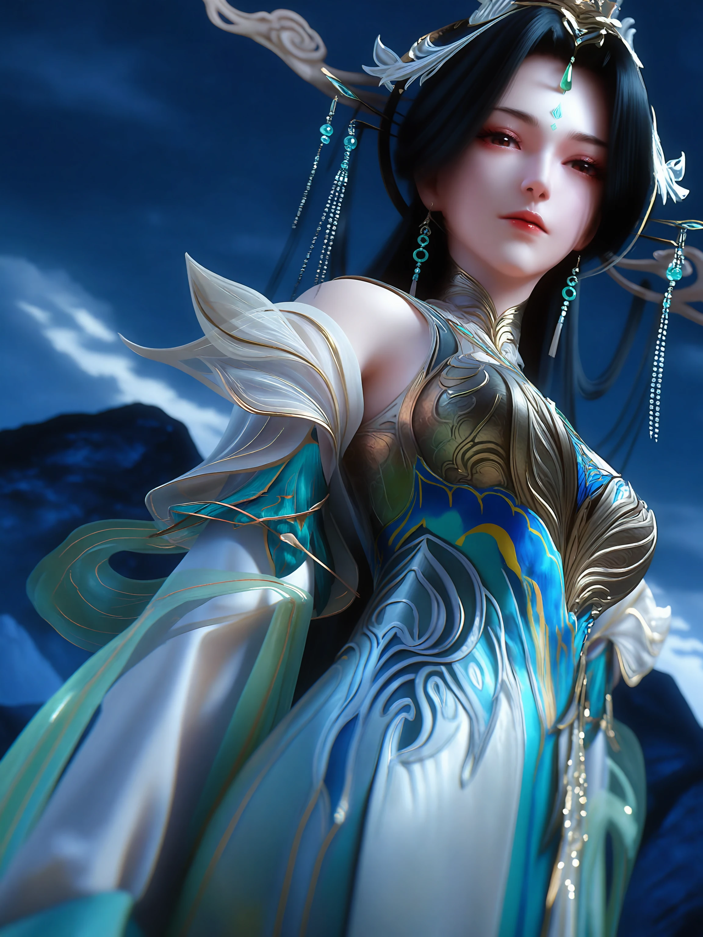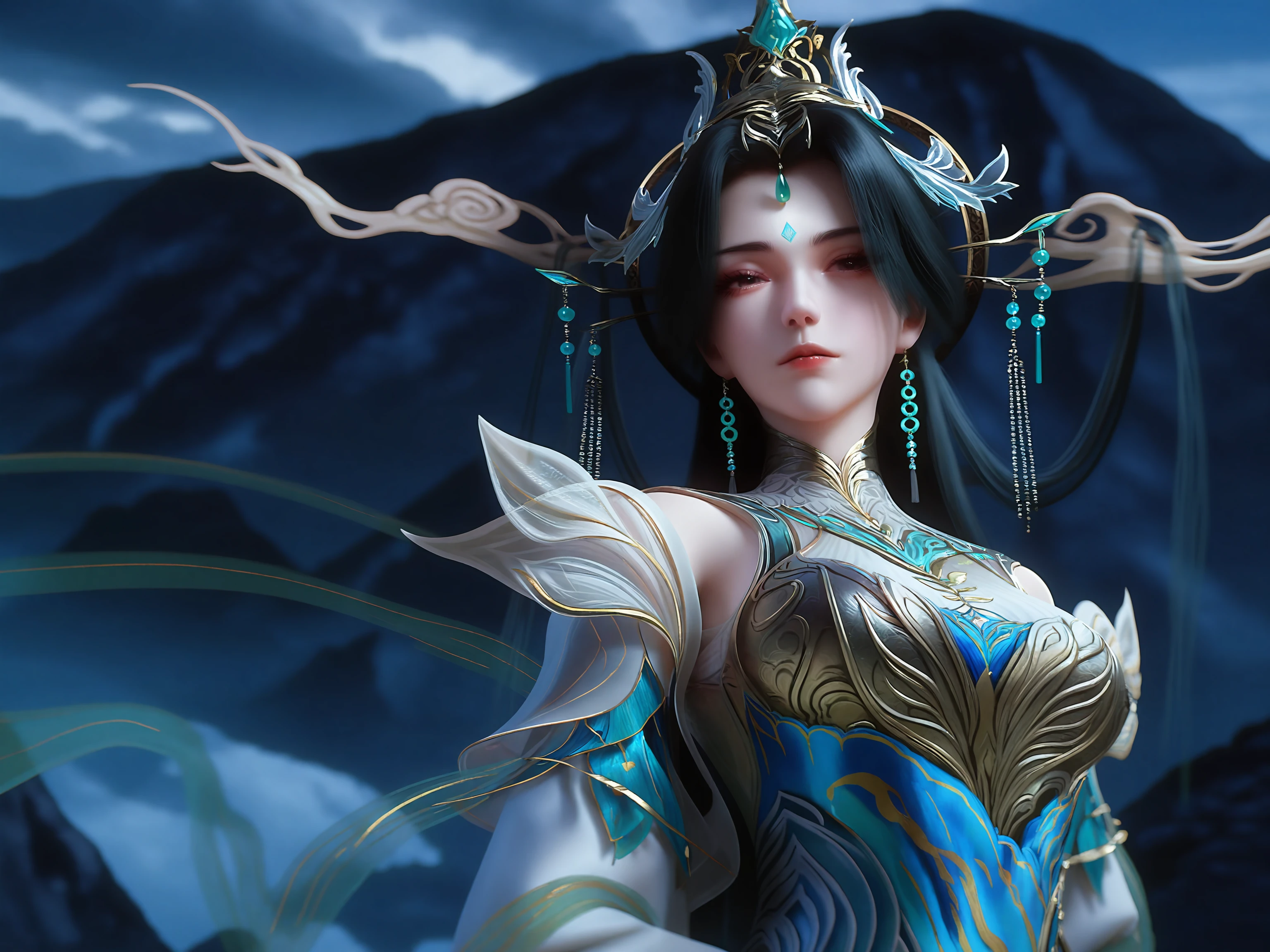 1girl, dress, long hair, hair ornament, black hair, forehead mark chinese clothes, jewelry, ribbon, ribbon trim