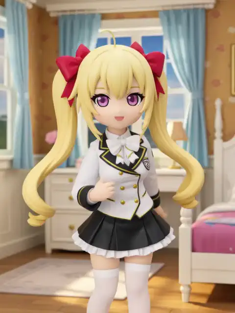 sample prompt:Takamiya Rion, anime-style girl. The image features an anime-style character with long blonde hair styled in twin tails, each adorned with a red bow. The character has striking purple eyes and is wearing a white uniform with black trim.The uniform includes a high collar with a large bow tie, gold buttons, and a black and gold emblem on the ?????. paired with a black skirt that has a frilled hem, white knee-high socks (she is dancing:4.0), (chibi Nendoroid:4.5) in bedroom.