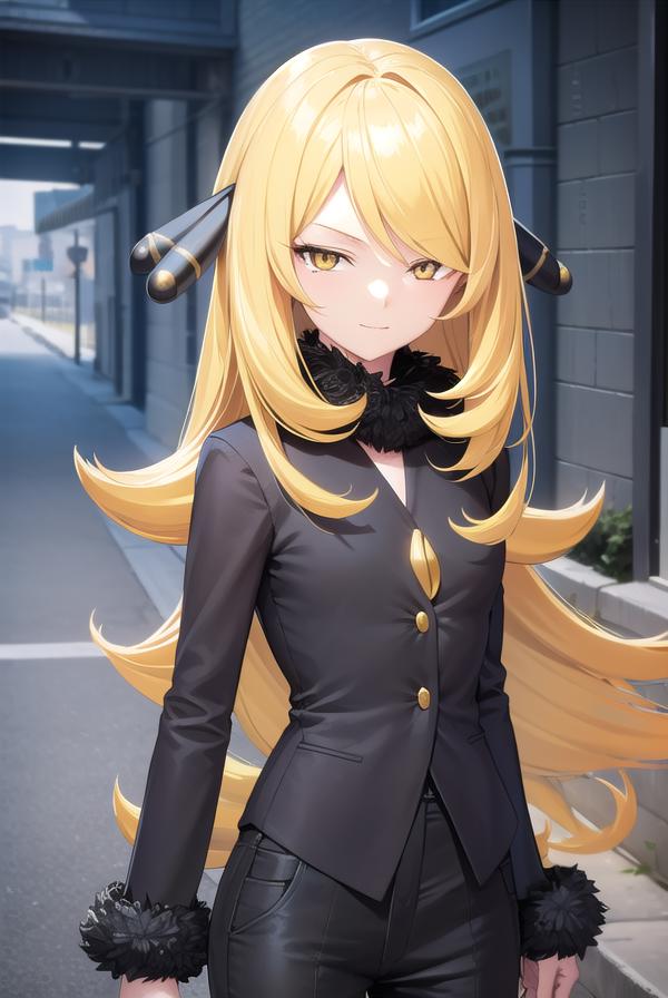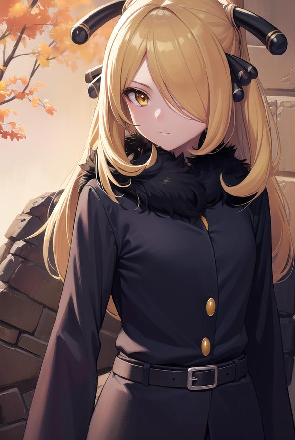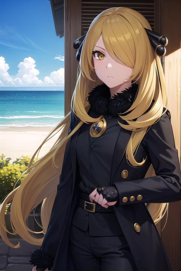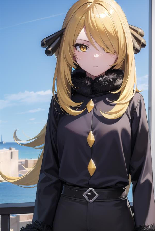 pokemoncynthia, blonde hair, hair ornament, hair over one eye, long hair, (yellow eyes:1.5),
