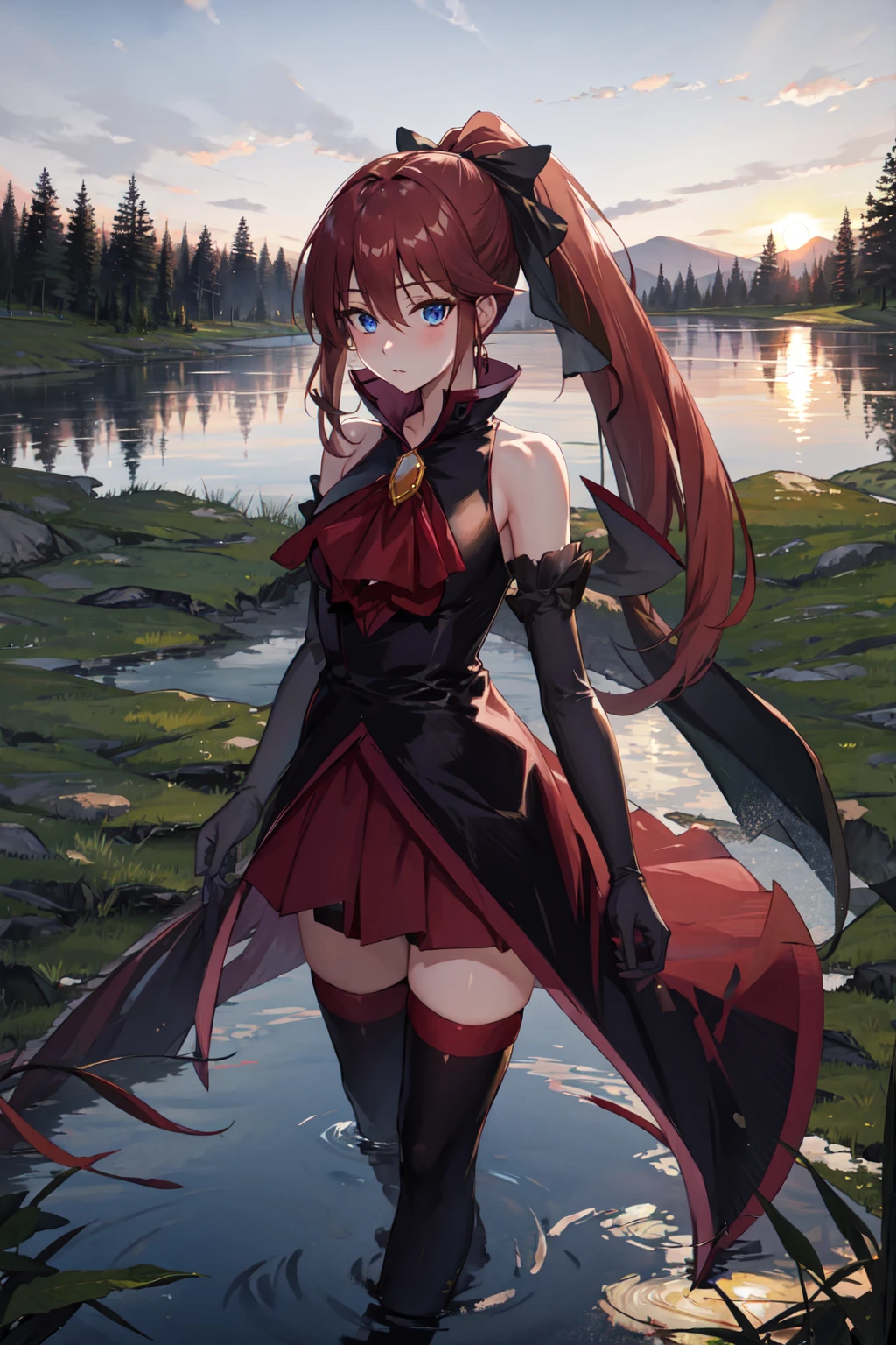 uunlovely, red ponytail, long dress, brooch, hairbow, elbow gloves, black thighhighs