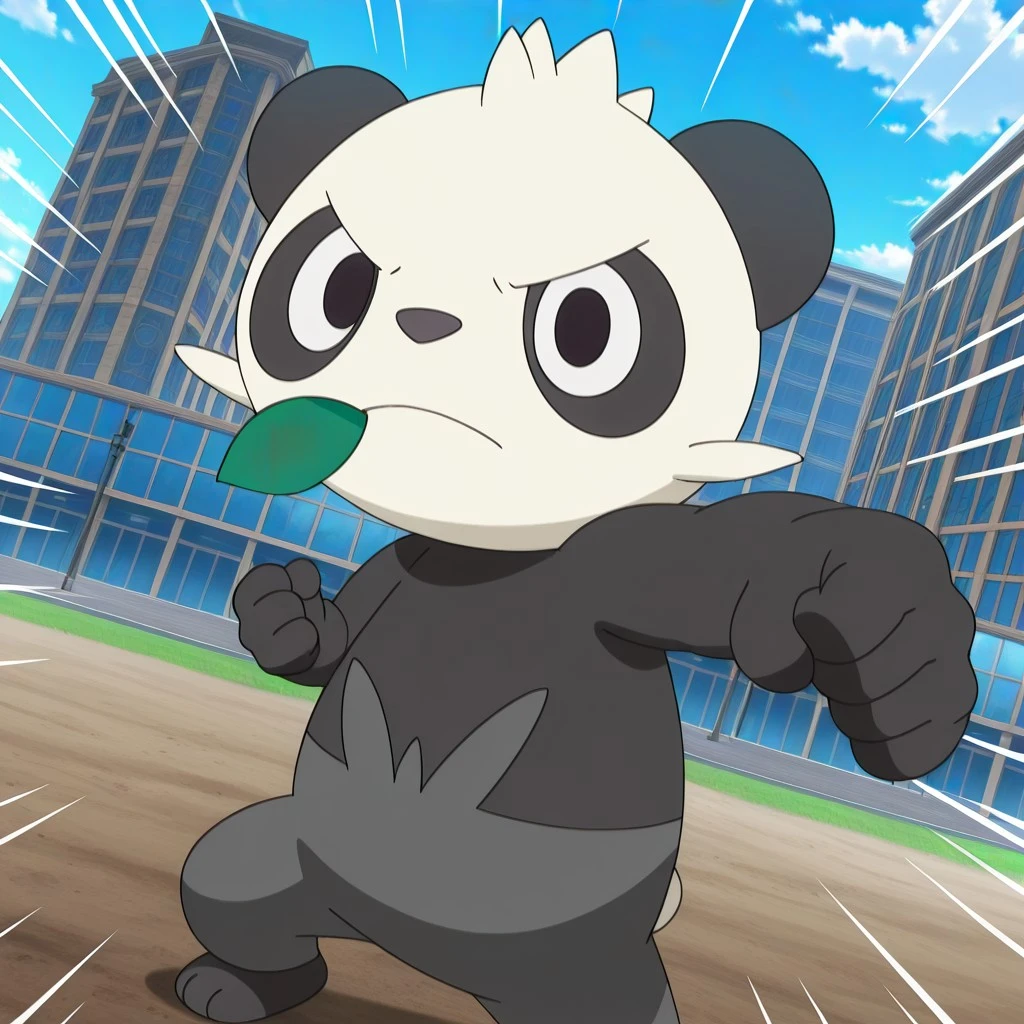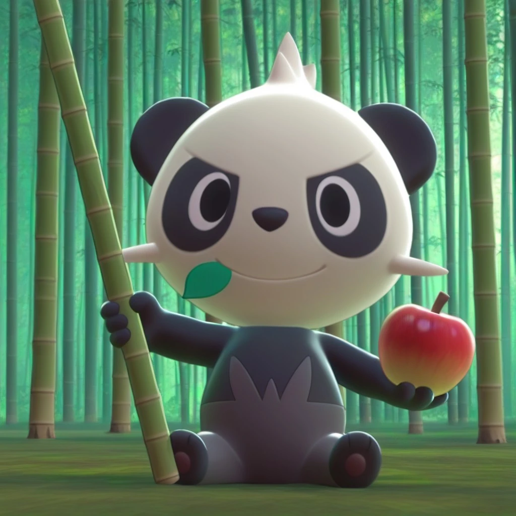 Tags: pokemon (creature), leaf in mouth, mouth hold, panda, white head, black nose, black ears, black circles around eyes, black eyes, black and gray body,